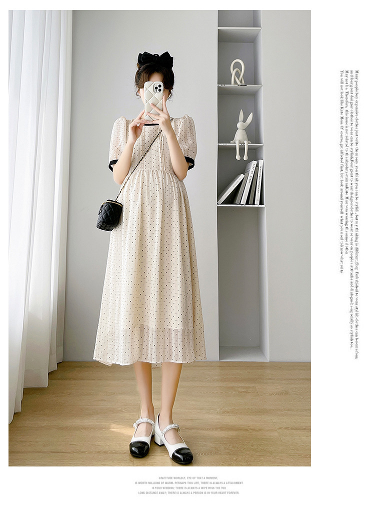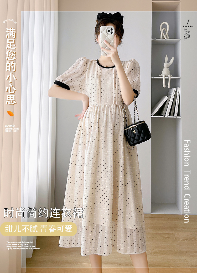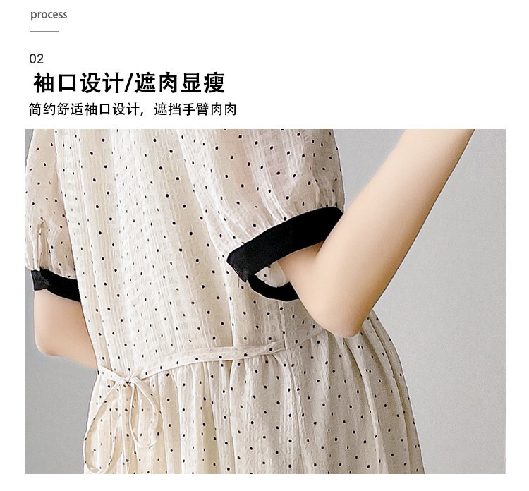 白のしわ加工地に黒のドットが小さいロング丈ワンピ
