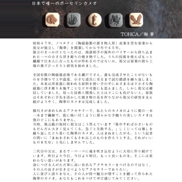 受け継がれてきた技を守り、ひとつひとつ手作業で作られるカメオ。職人歴30年以上の2代目がすべて手仕事で仕上げています。グレーベースにホワイトのライオンが浮き上がるように施された繊細なカメオのネクタイピンです。優雅な胸元を演出してくれます。<陶磁器カメオについて>陶磁器で出来ているため、落としたりぶつけたりすると、衝撃により割れたりかけたりすることがあります。お取り扱いには十分ご注意ください。<カメオのお手入れ方法>カメオの表面についた汚れは、きれいな消しゴムで擦って取ることができます。金具部分はコーティングを施しておりますので、乾いた柔らかい布で汚れを取ってください。研磨剤入のクロスはコーティングを剥がしてしまう恐れがありますので、ご使用をお控えください。同デザインのカフス、カフスとタイピンのセットもあります。サイズ=17(縦)×17(横)×4(厚み)mm×48(長さ)mm素材=真鍮・22金コーティング、陶磁器ブランド=陶華TOHCA生産国=日本ケース=ボックス入土日祝日も14時までの決済完了で、当日出荷中。※年末年始を除く。