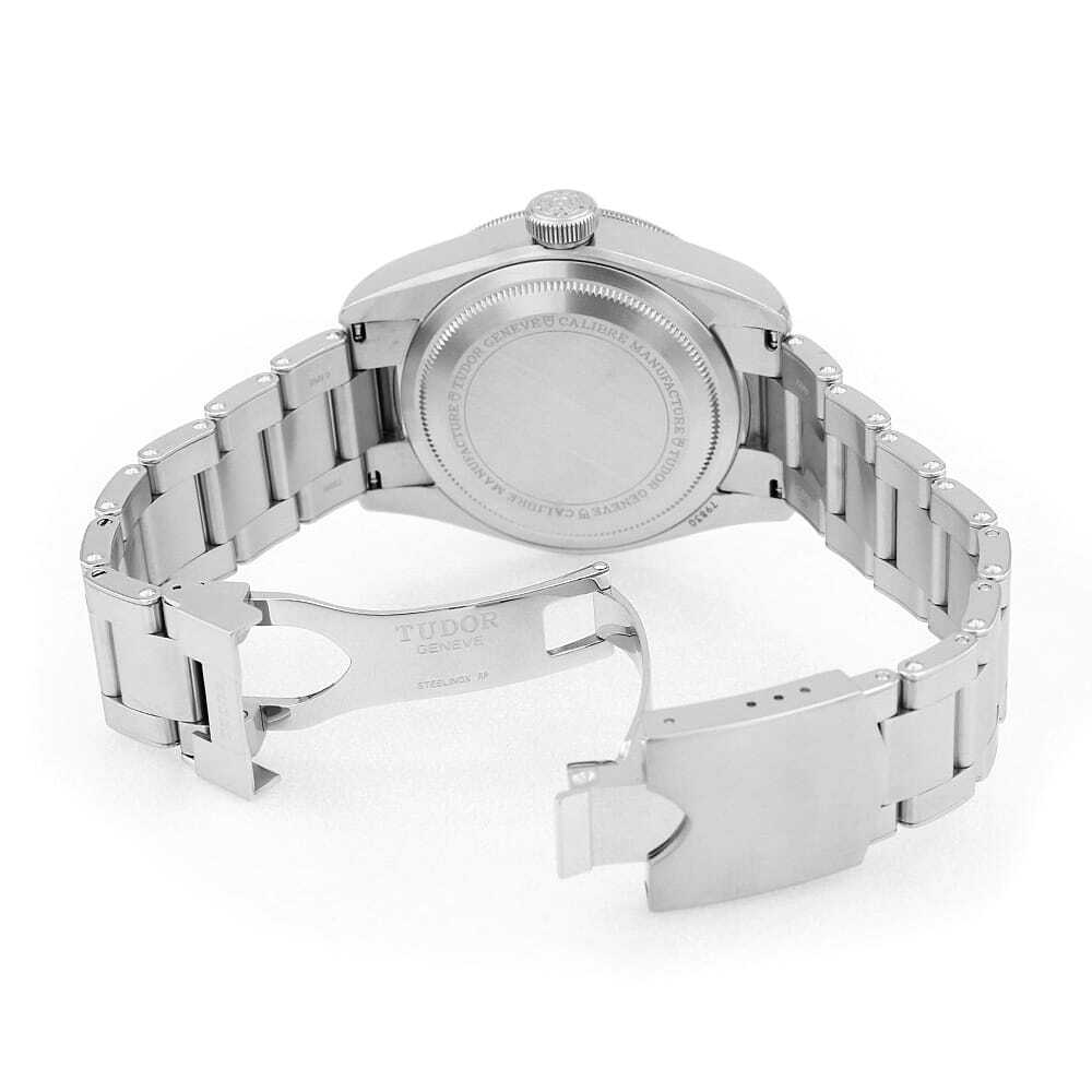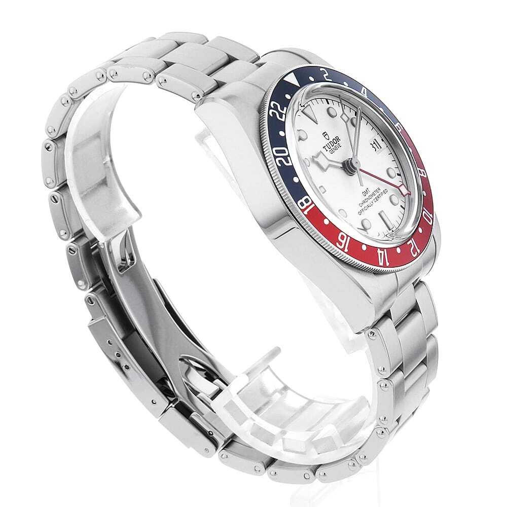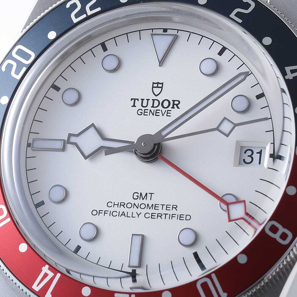 | モデル情報 | ROLEXのディフュージョンブランドとして知られるチューダー。その2018年発表モデルヘリテージ・ブラックベイ GMTです。時針だけでなく、赤いGMT針と秒針の形が通称「イカ針」になっていることが特徴です。またこちらは、2023年に新たに登場した爽やかなオパラインダイアルになります。自動巻きCal.MT5652搭載。200m防水仕様。 |