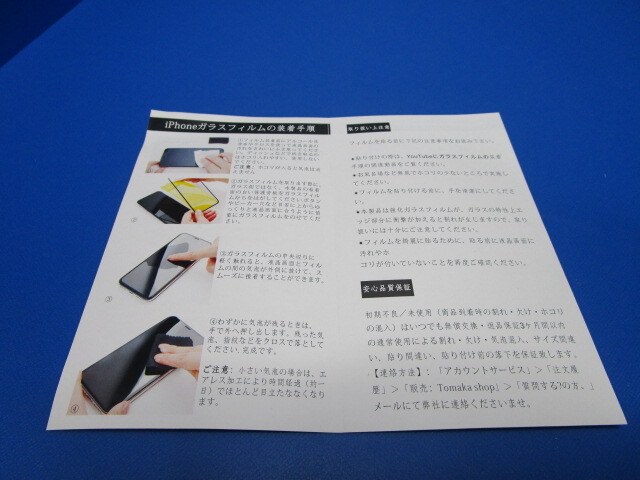 取扱い説明書にiphoneガラスフィルの装着手順と記載があります。