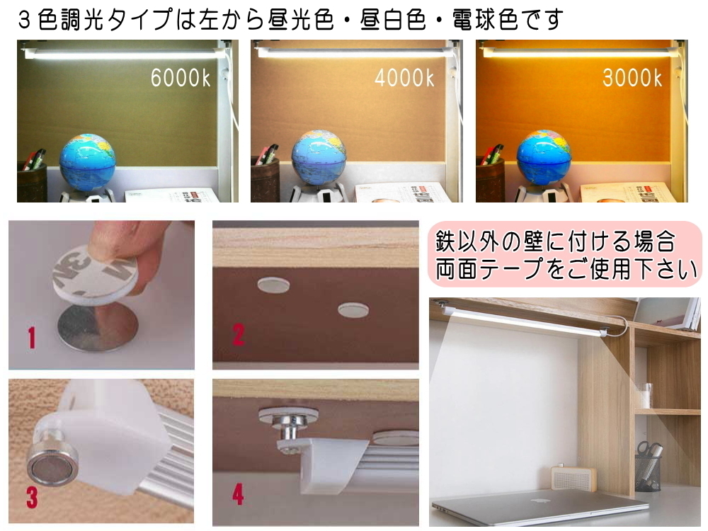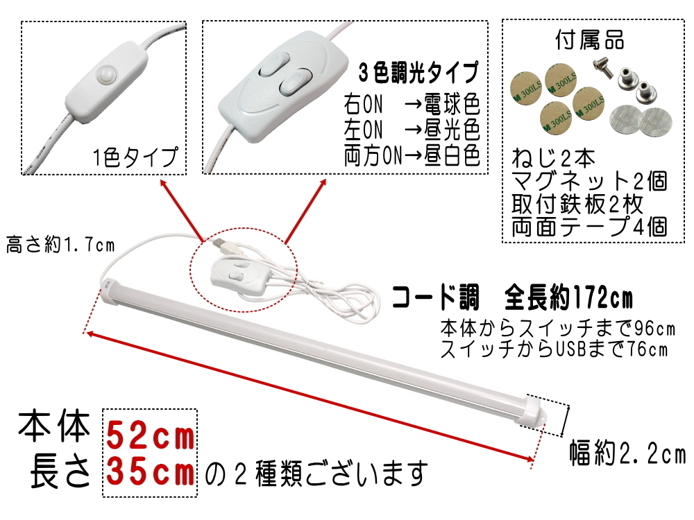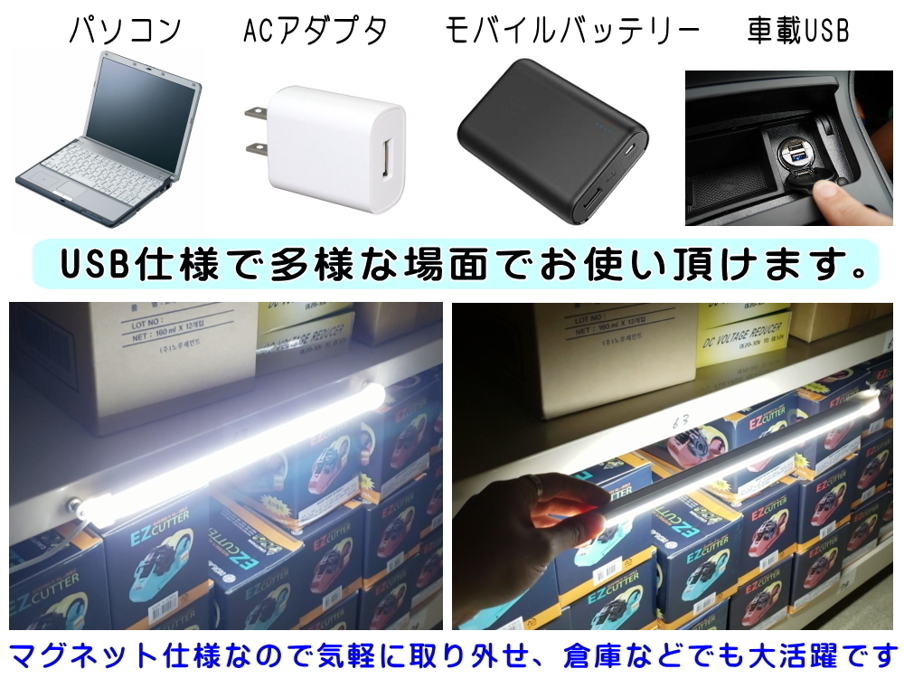 LEDバーライト 1灯タイプ 52cm USBライト 昼光色 マグネット取付 切替ライトバー 間接照明 キッチン用 デスクライト スティックライト 4