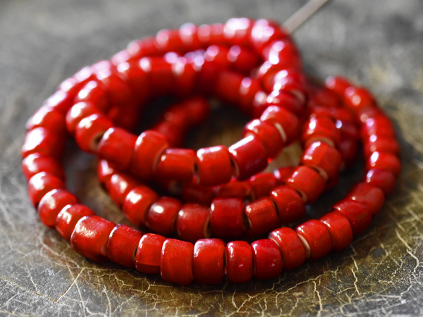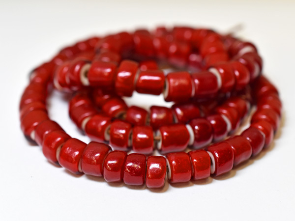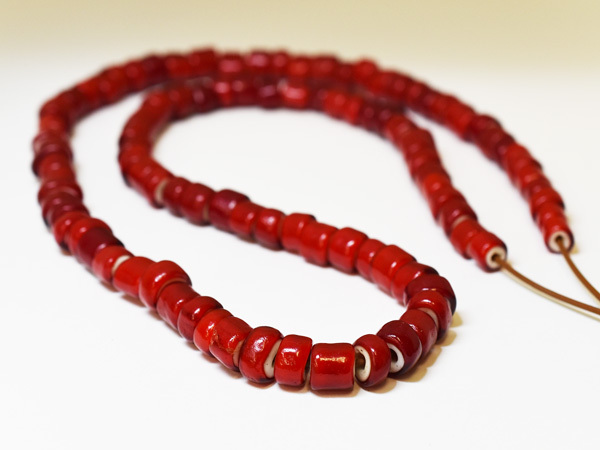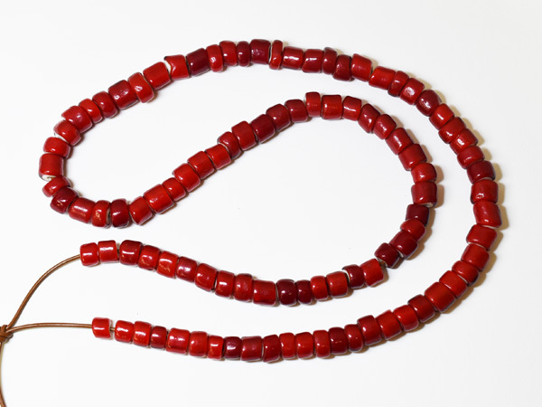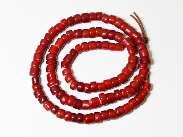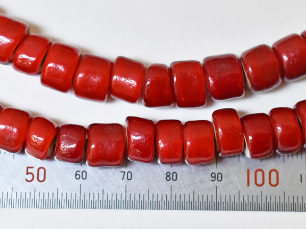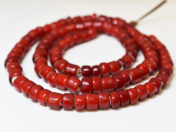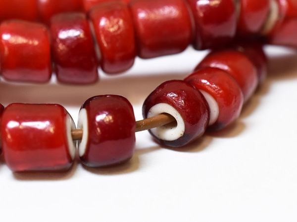 外側がやや濃い赤色で芯が白い、極太サイズのホワイトハート一連です。稀に見る素晴らしい雰囲気、サイズと表情を持つ一連です。一連中10粒程度の血赤クラスの極濃赤を含んでいます。最大で直径12mmの粒を含んでいます。ここまで大きなサイズで、この雰囲気を持つ一連は、現在では入手がかなり困難となっております。ほぼ全ての粒に当店取扱の3mm、5mm幅の革紐がいずれも通ります。形状、色、粒や孔の大きさにはやや個体差があります。数粒に気泡に因ると思われる細い空洞のような線がありますが、全体的に状態は概ね良好です。