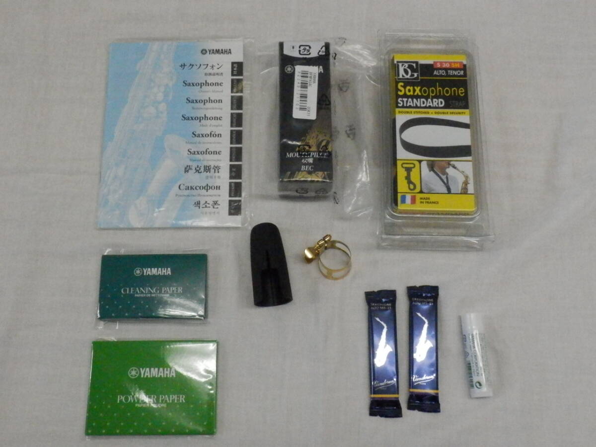 付属品として新品ヤマハマウスピース(AS-4C)・BGストラップ・取扱説明書・コルクグリス・リード2枚・パウダーペーパー・クリーニングペーパーが付きます。おまけでマウスピースキャップ・リガチャーもお付けいたします。