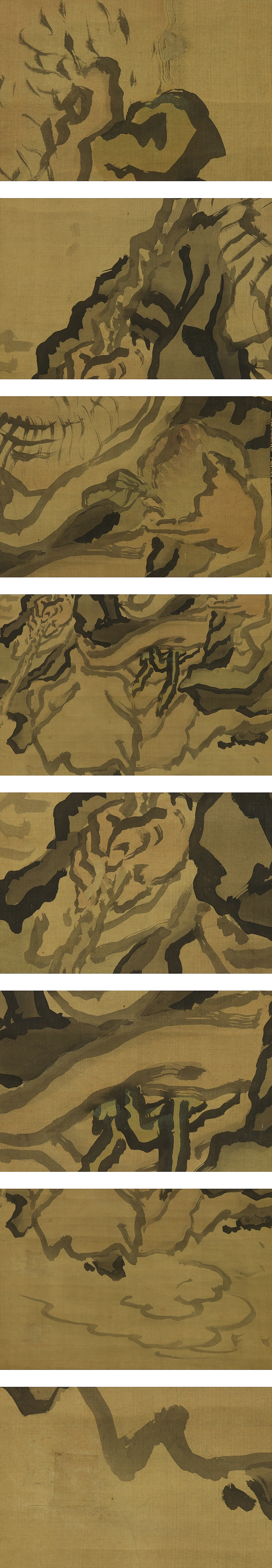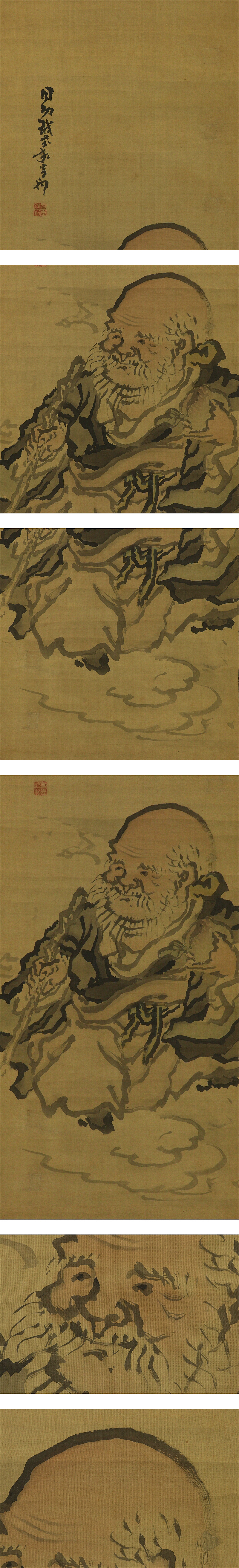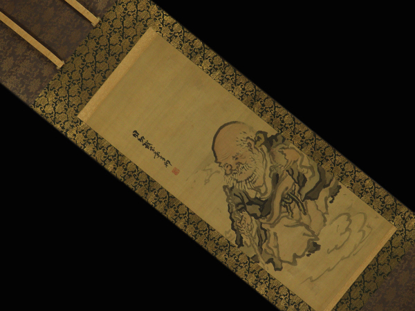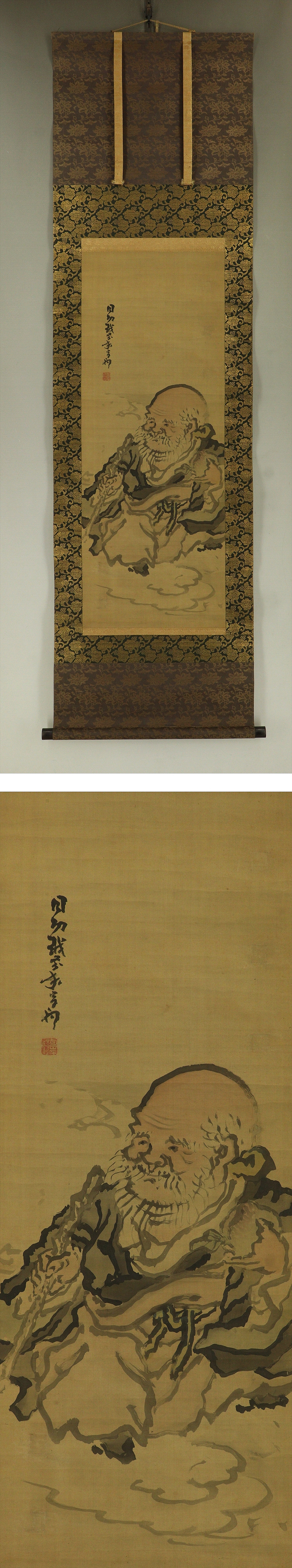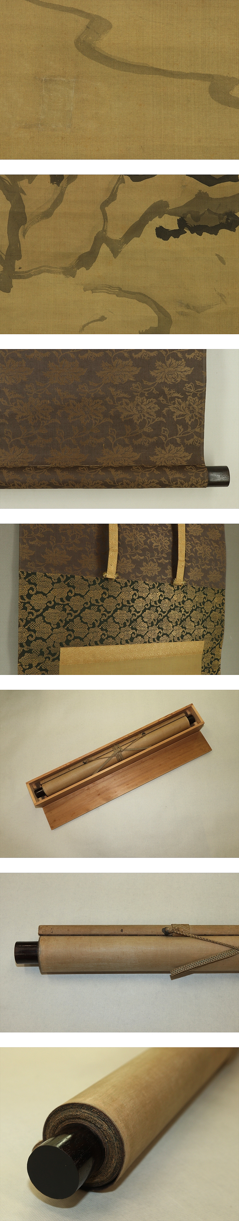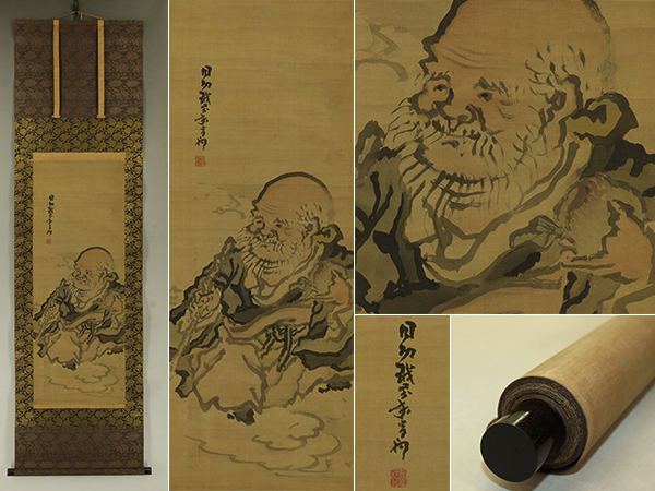 岸駒 がんく(1756-1839) 江戸時代中期-後期の画家。 宝暦6年生まれ。岸派の祖。はじめ狩野派を,のち沈南蘋や円山派などの画風をまなぶ。 鳥獣,とくに虎を得意とし,独自の画風を確立した。京都御所や金沢城の障壁画を制作。 天保9年12月5日死去。83歳。加賀(石川県)出身。 本姓は佐伯。名は駒,昌明。字は賁然。通称は雅楽助。号は華陽,蘭斎など。 本紙は、染み、汚れ、強めの折れ多数、皺、ヤケ、修復痕があります。 表装は、染み、汚れ、折れ、皺、虫食、破れ、ほつれ、くすみ、軸先にキズがあります。 【サイズ】 作品 横約36cm×縦約95.5cm 表装 横約50.5cm×縦約178cm |