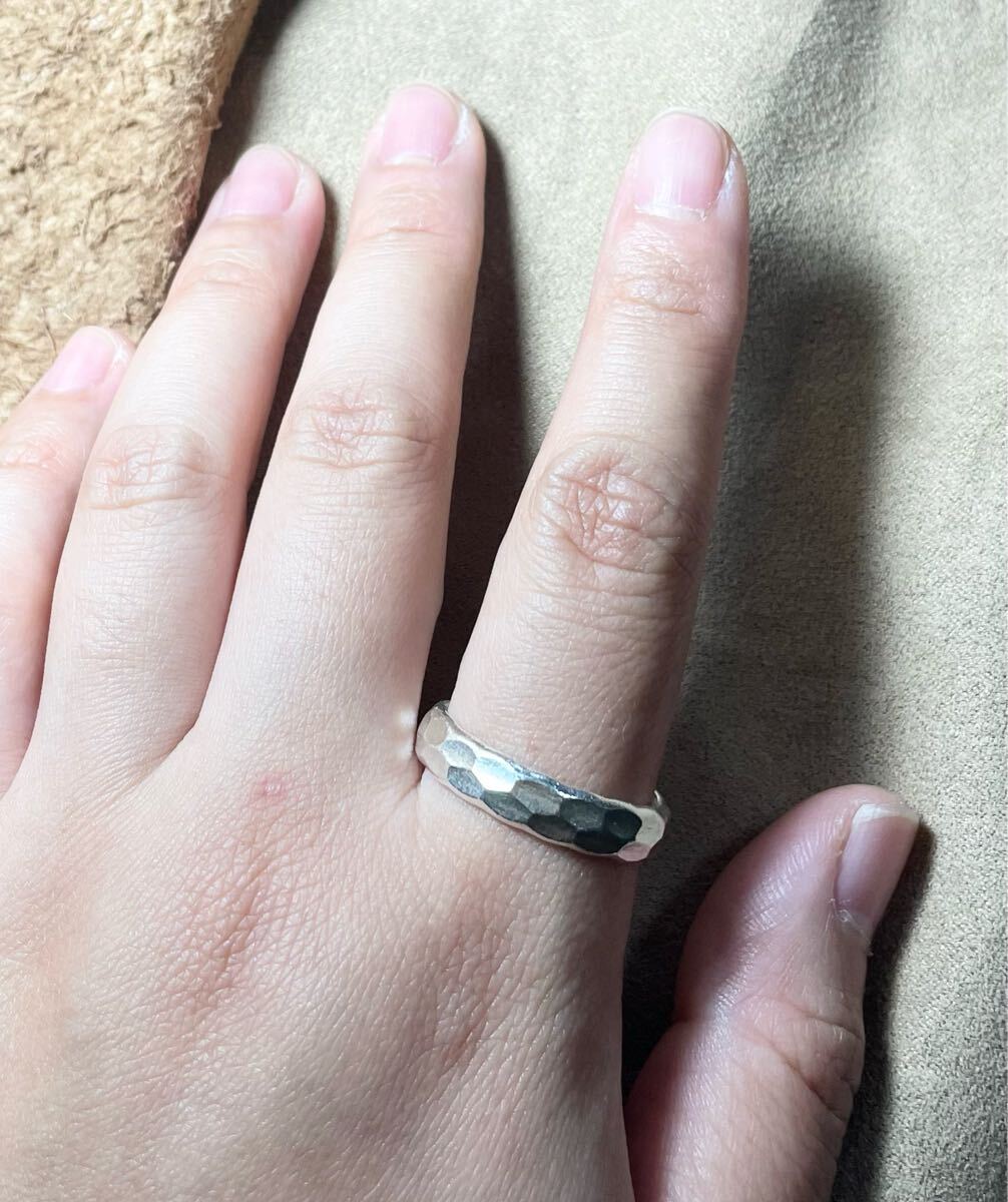 「平甲丸(ひらこうまる)」。 甲丸と平打ちの中間のような形状で、指輪の外側がゆるやかな曲面になっています。 しっかりとした存在感がありながら、柔らかな印象も感じさせます。 甲丸の丸みが似合わない、または平打ちだとシャープ過ぎるという人におすすめ。