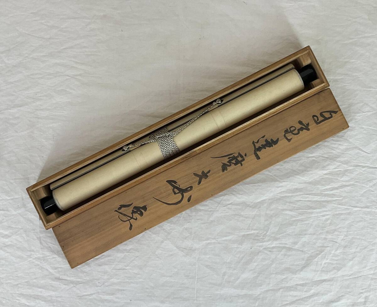 古い掛け軸は軸先を固定している接着剤が弱り、輸送途中の衝撃で軸先が外れてしまう場合がございます。
