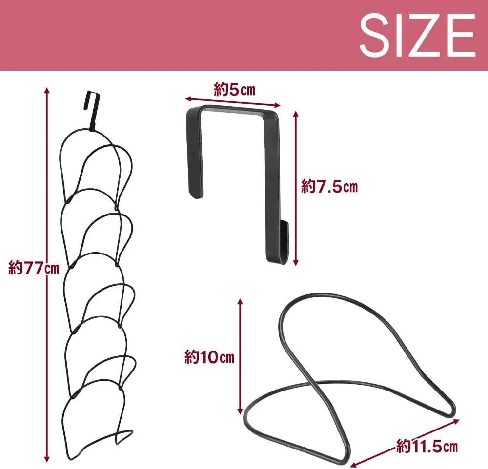 【セット内容】ハンガー×5点 フック×1点 【サイズ(約)】ハンガー:11.5cm×10cm 設置ドア幅:4.5cm以下