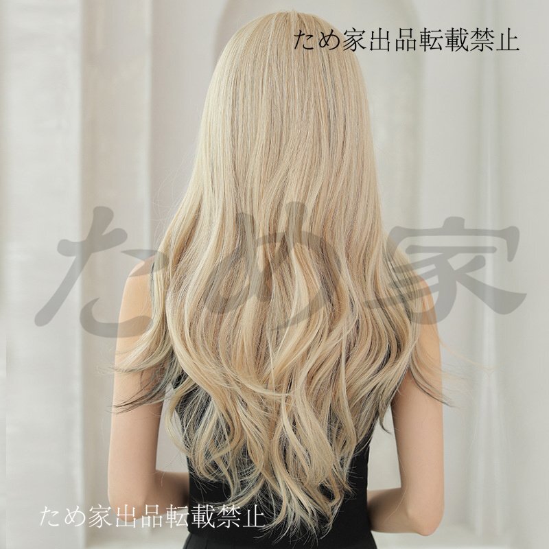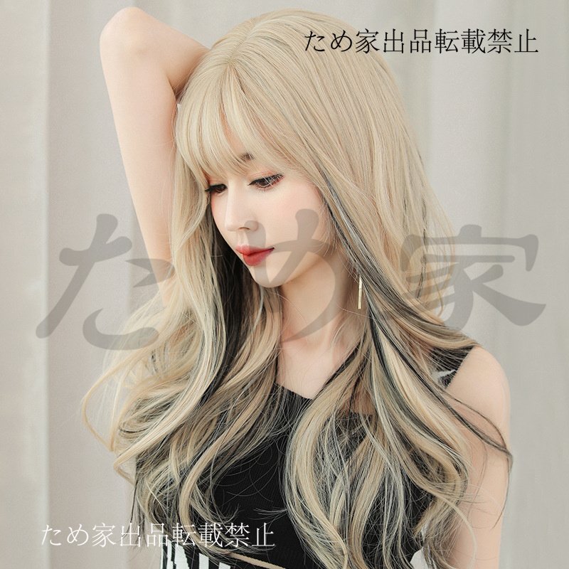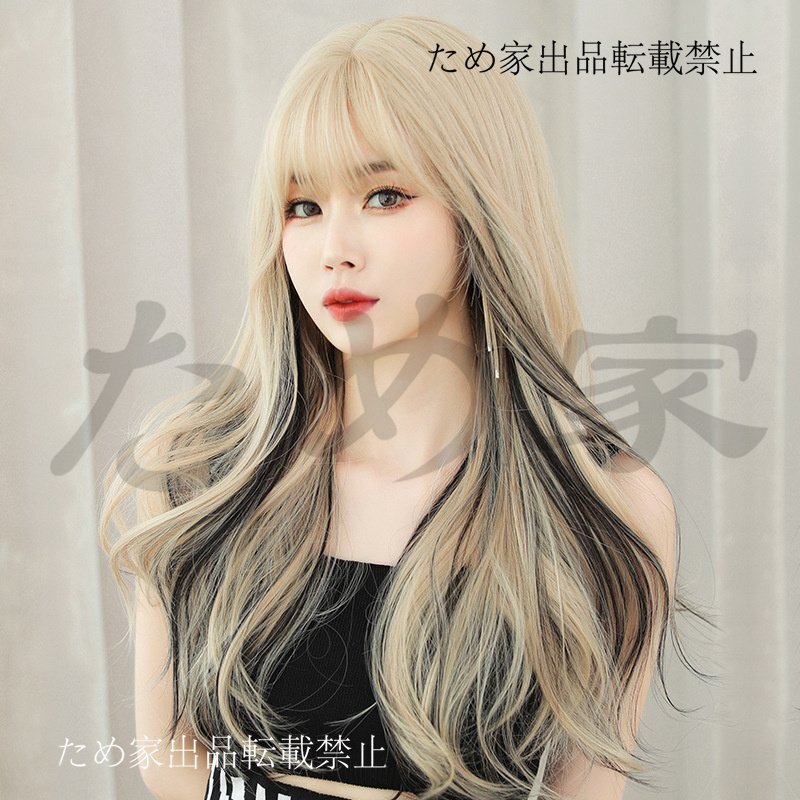 新品人毛 ロングカールウィッグ 欧米風 ストレートバング ハイライト入り クリーミーブラックティー つむじ部分手植え 自然に見えますフル