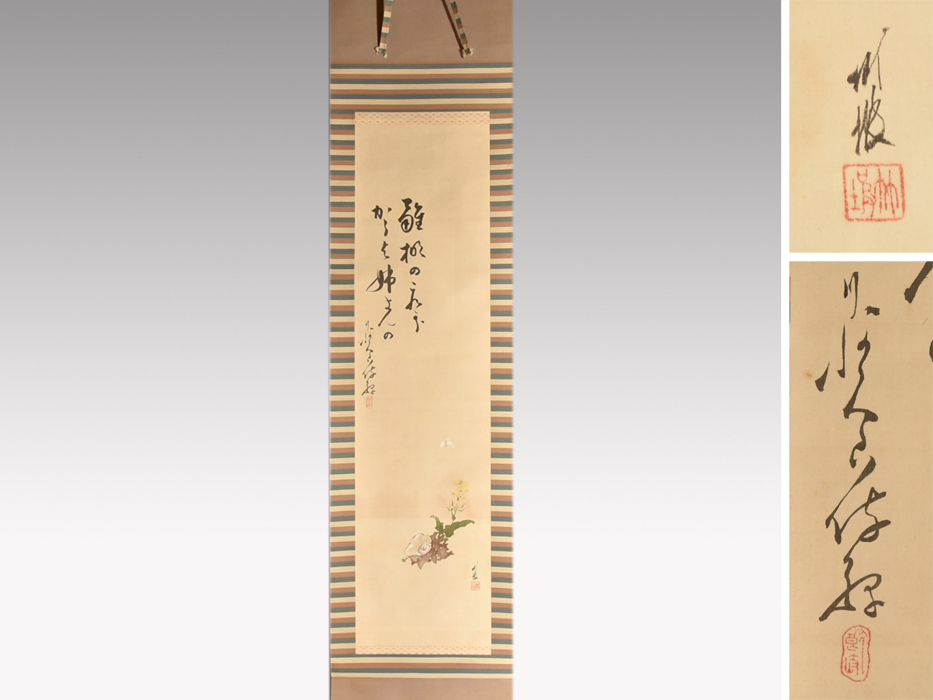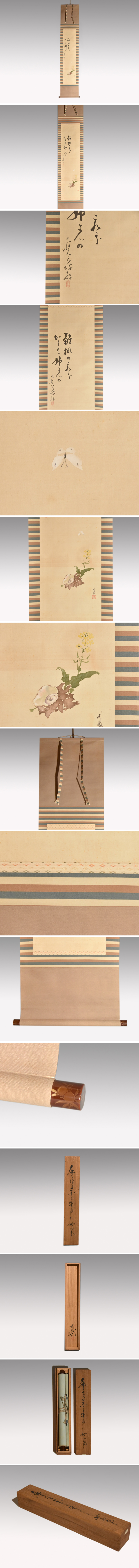 【真作】尾竹竹波 画賛軸装 「栄螺・菜の花・蝶」軸 掛軸 共箱 |