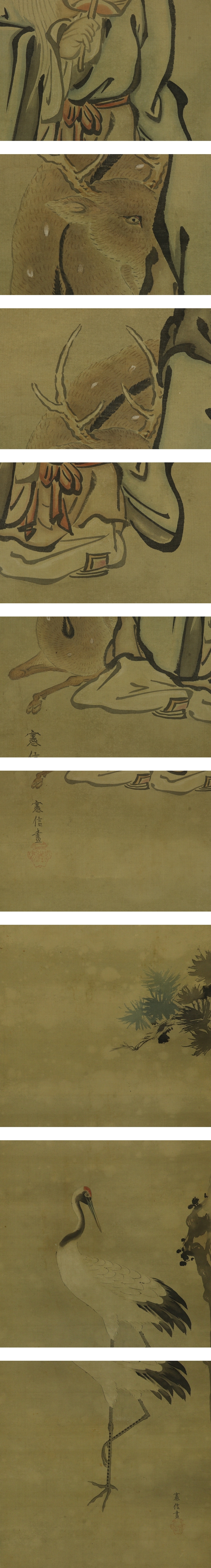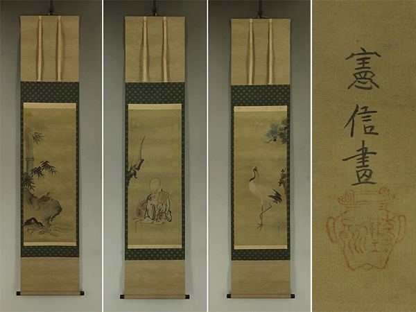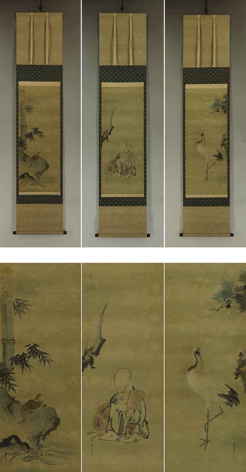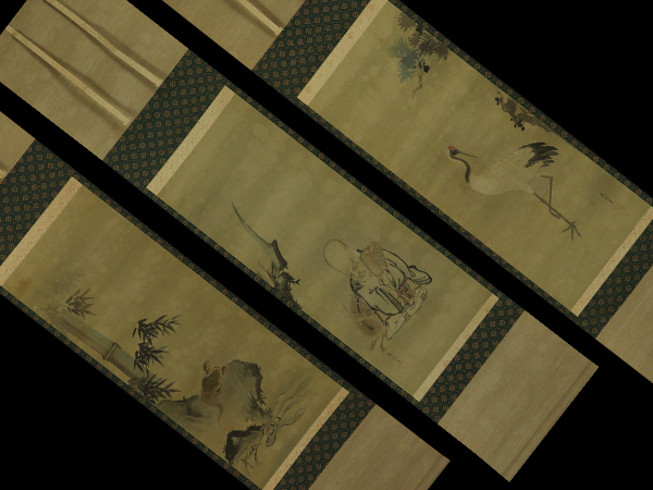 | №2502037【模写】狩野憲信【三対幅・慶祝図】◆絹本◆合箱◆掛軸 | |