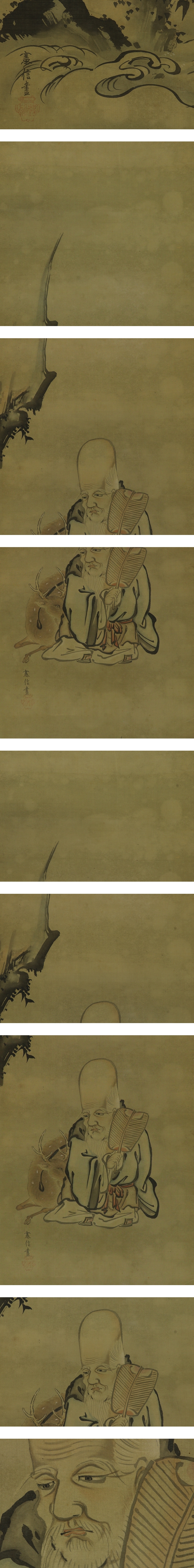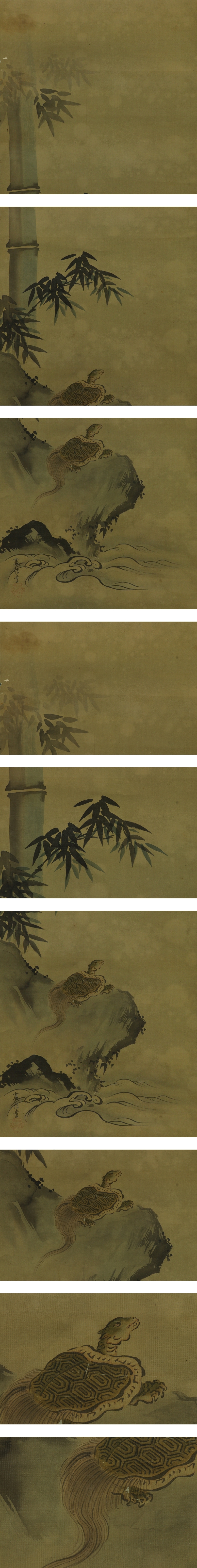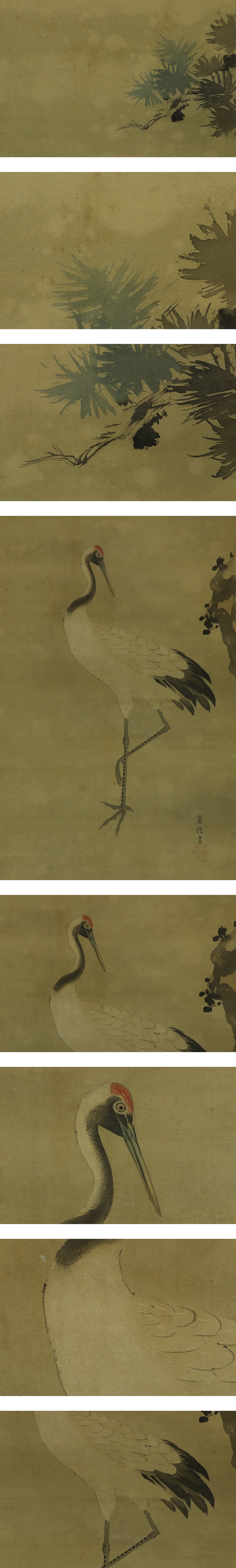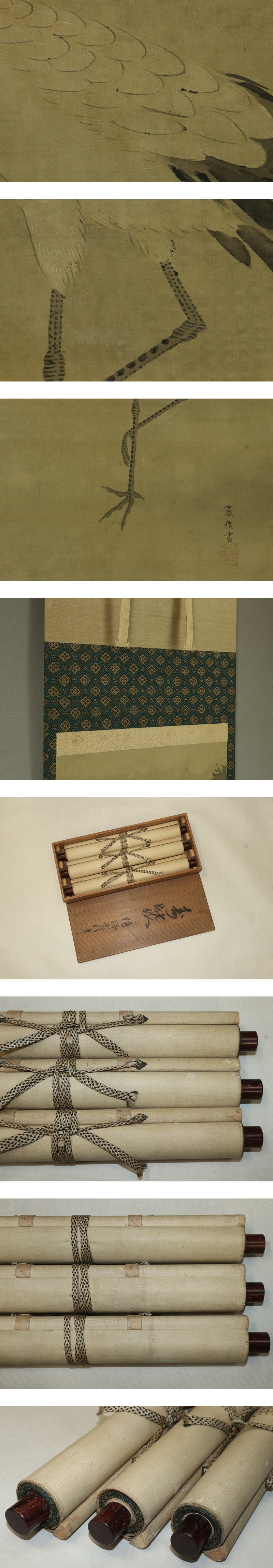 狩野憲信 かのう-のりのぶ(1692-1731) 江戸時代中期の画家。元禄5年11月2日生まれ。 狩野主信(もりのぶ)の長男。父の跡をうけて中橋狩野家を継ぐ。 宝永6年(1709)御所の障壁画を,享保4年朝鮮への贈呈屏風を描いた。 享保16年9月17日死去。40歳。号は祐盛,永真。 本紙は、染み、汚れ、折れ、皺、虫食い、ヤケがあります。 表装は、染み、汚れ、折れ、皺、虫食い、破れ、ほつれ、生地剥れがあります。 【サイズ】 作品 横約32.5cm×縦約82.5cm 表装 横約36.5cm×縦約172cm |