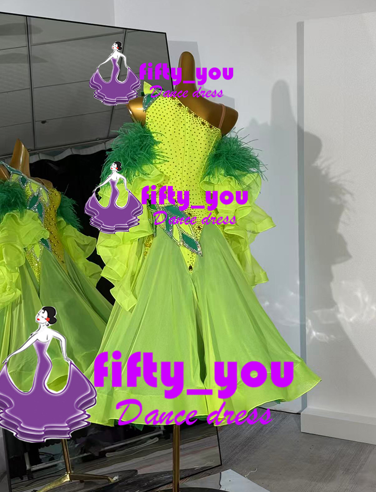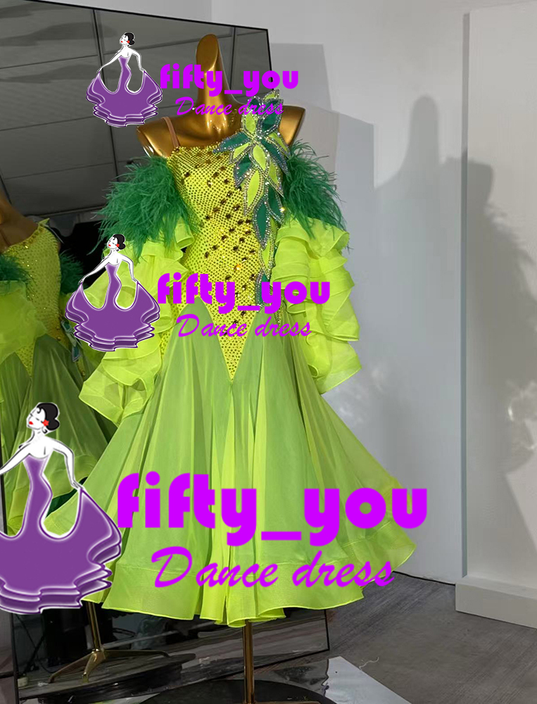 新品fifty_youオリジナルデザインレディース社交ダンス  モダンドレス 上品ワルツドレス セミオーダー  羽付きフロート 蛍光黄+緑
