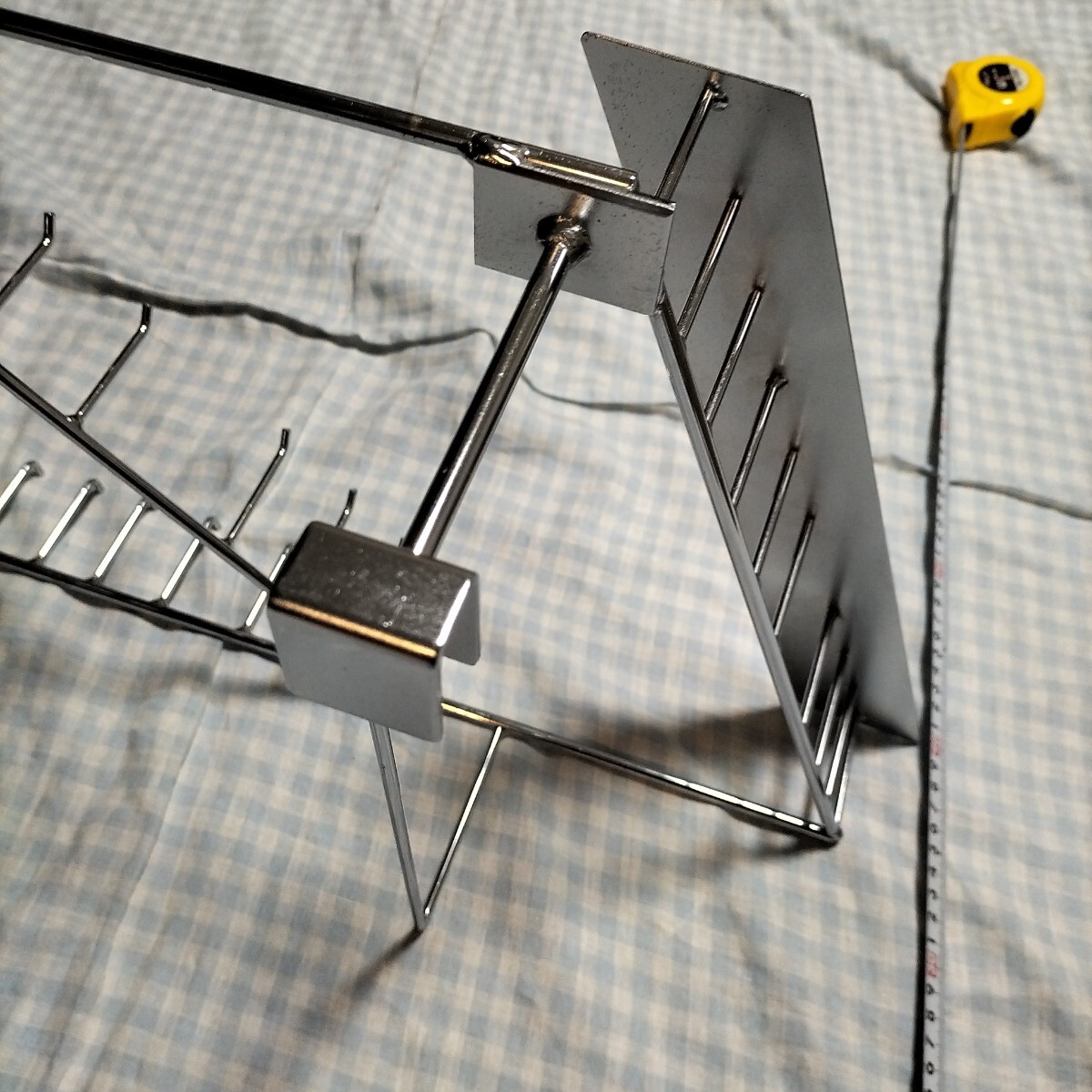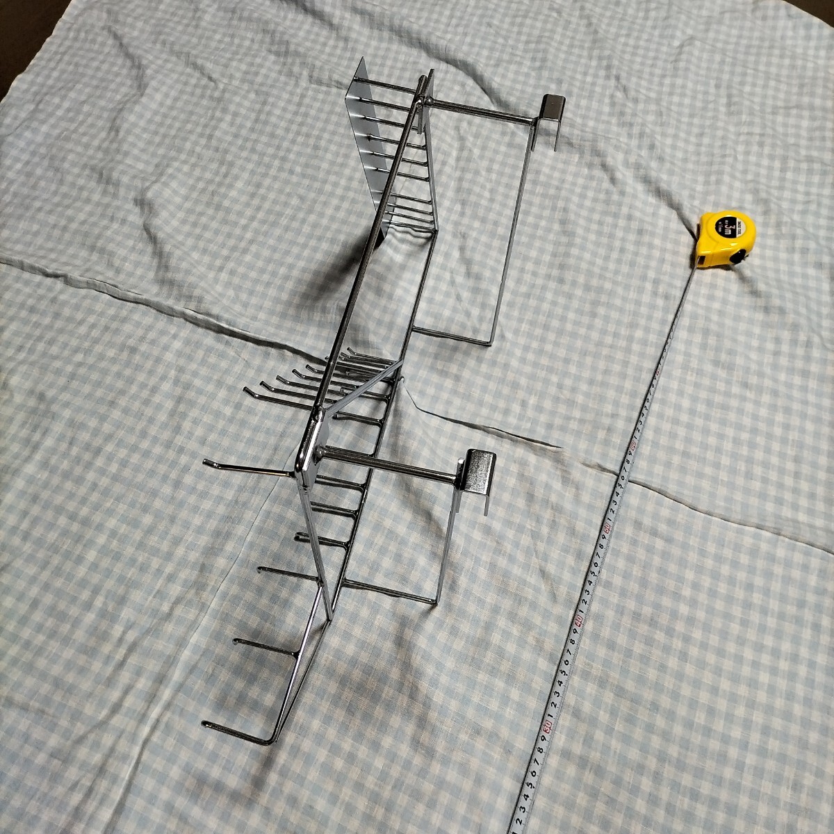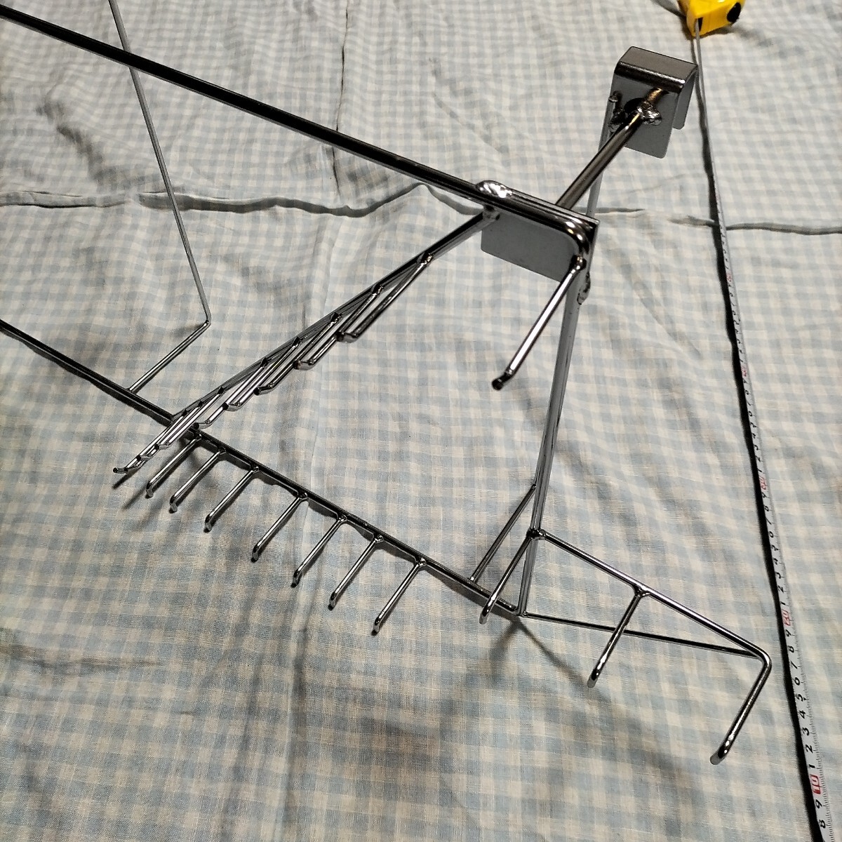 リサイクルショップで見つけ、何を掛けるために作られたものなのかわからないけど面白そうなので購入したものです。フックに色々掛けて使っていましたが、荷物を整理する時期が来たので出品します。素材はたぶんスチールにクロームメッキかと思います。サイズ 縦32cm横の最大67cm奥行10cm+6.5cmフックは1.5cmに掛ける事が出来ます。奥行合計18.5cm