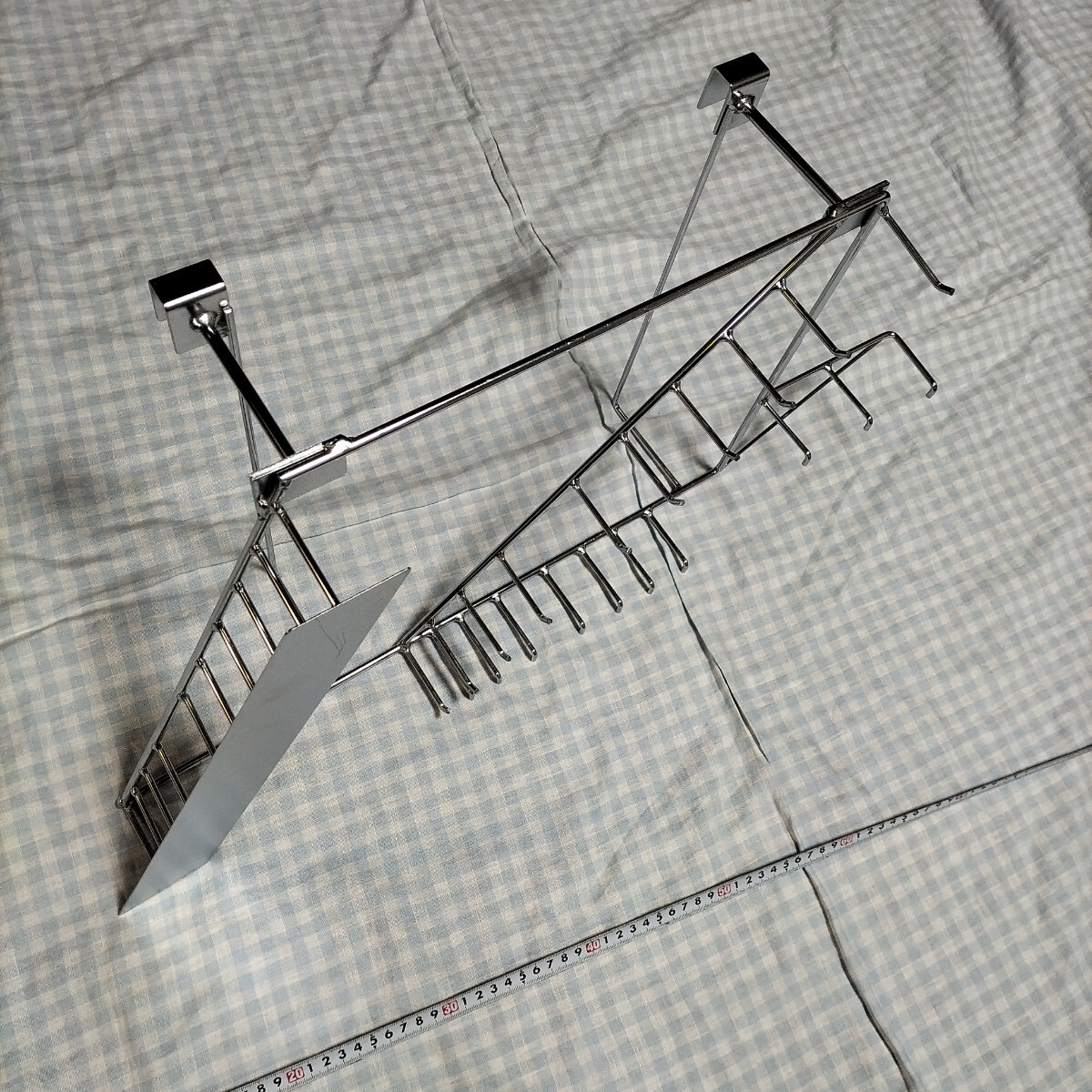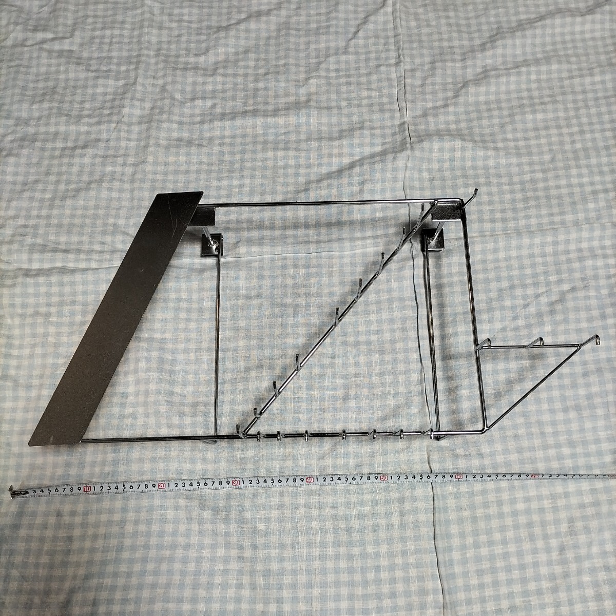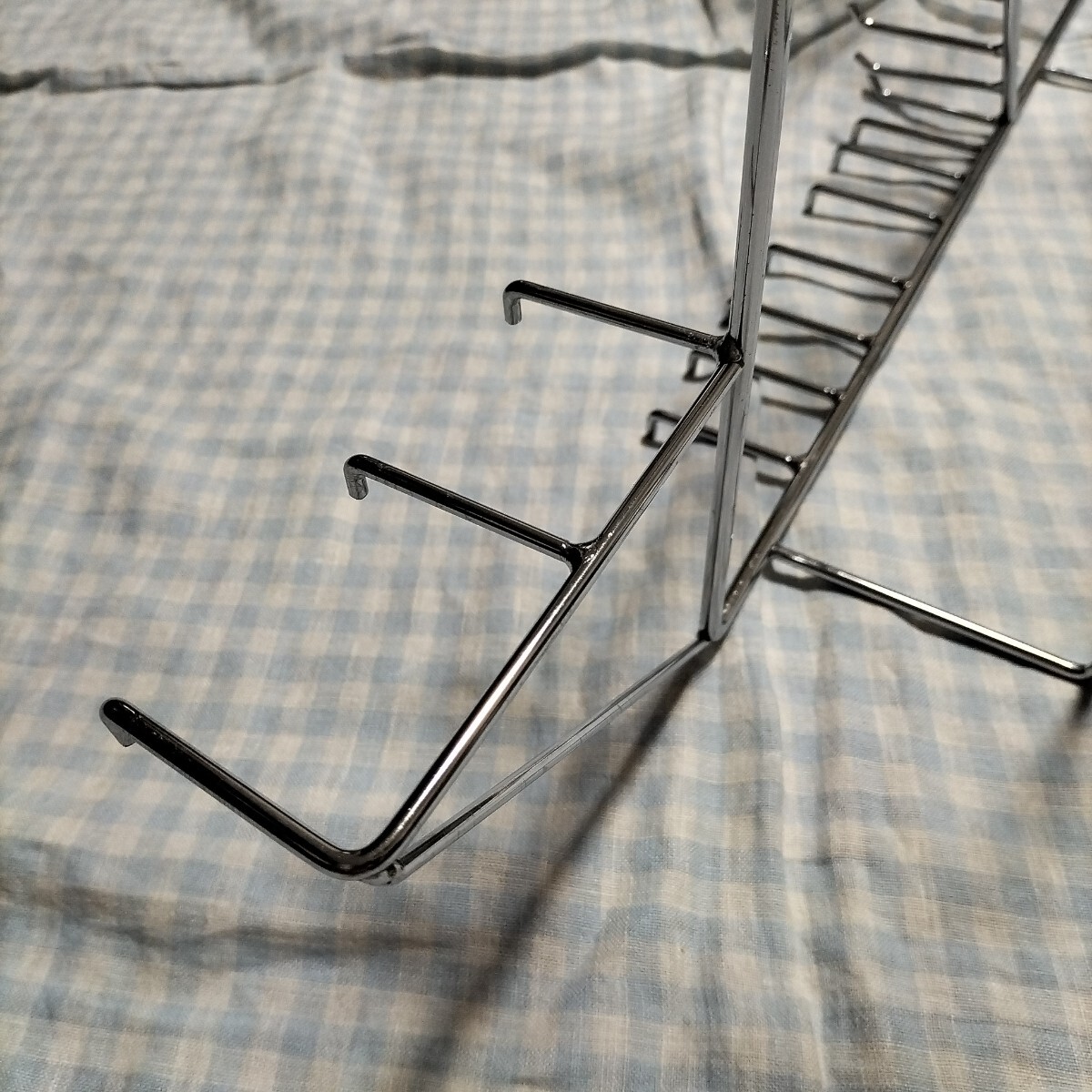 リサイクルショップで見つけ、何を掛けるために作られたものなのかわからないけど面白そうなので購入したものです。フックに色々掛けて使っていましたが、荷物を整理する時期が来たので出品します。素材はたぶんスチールにクロームメッキかと思います。サイズ 縦32cm横の最大67cm奥行10cm+6.5cmフックは1.5cmに掛ける事が出来ます。奥行合計18.5cm
