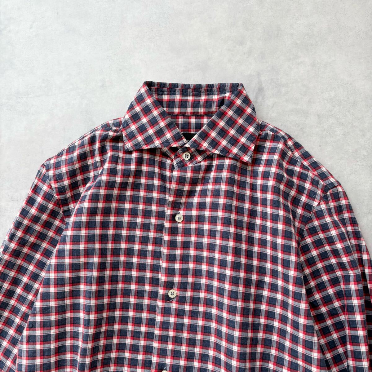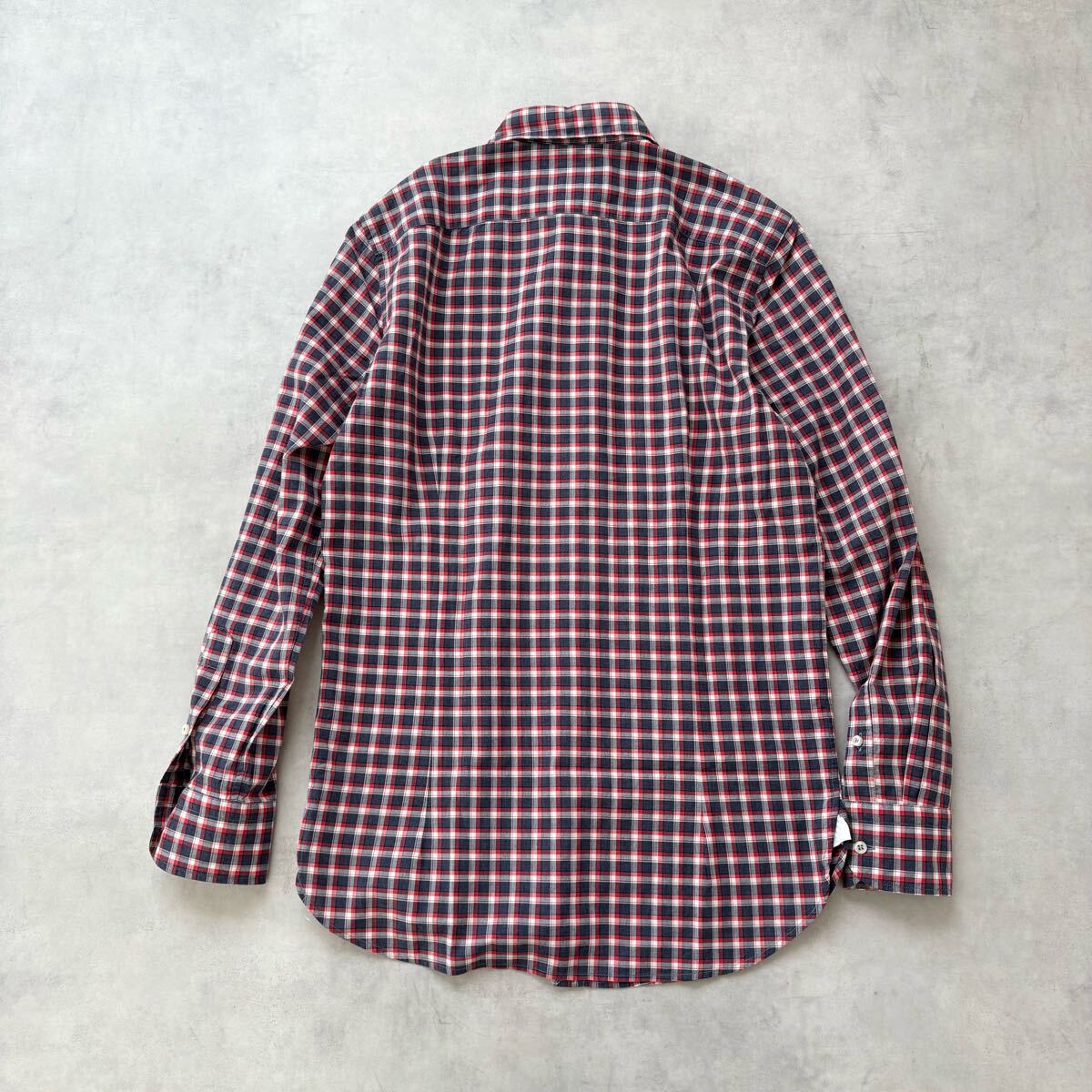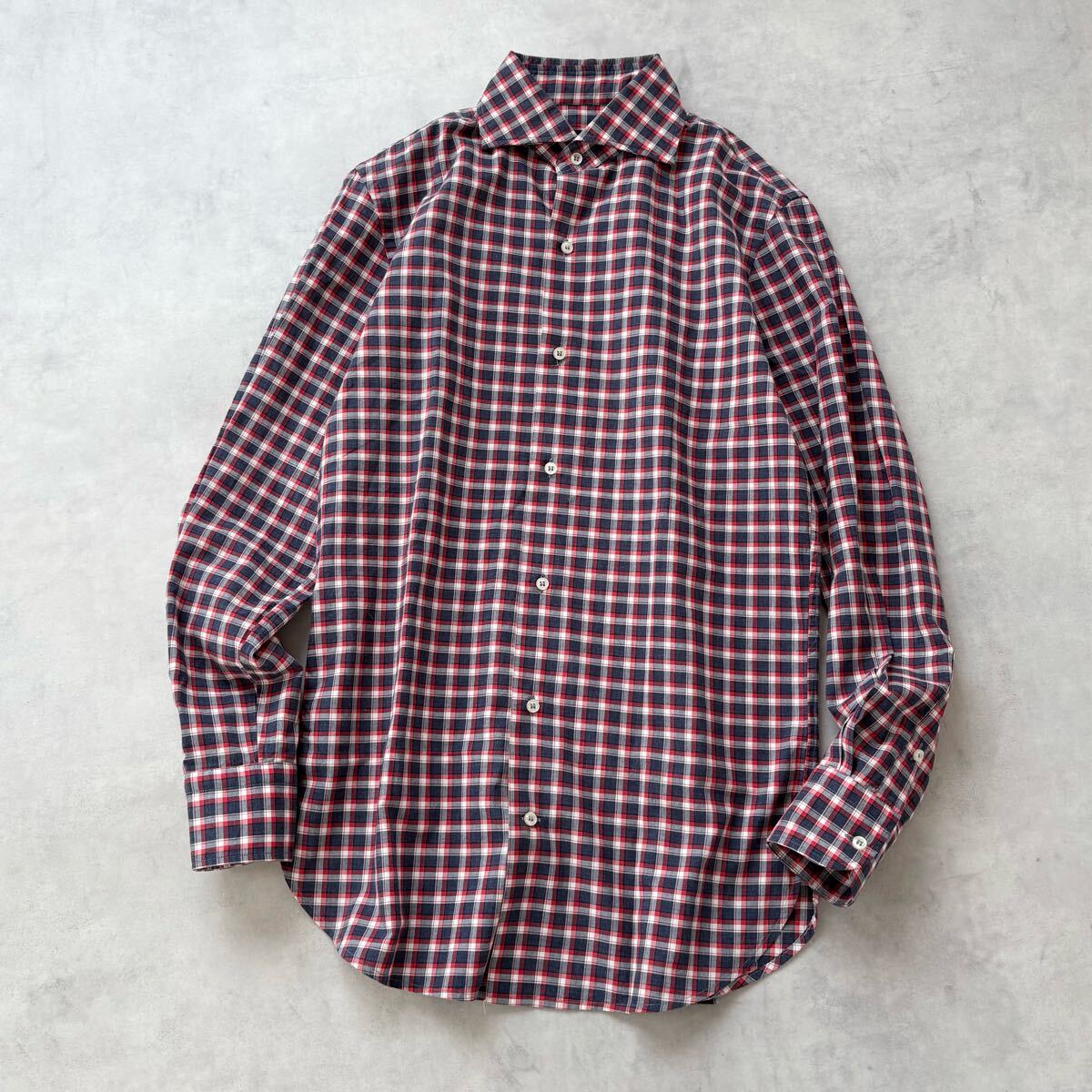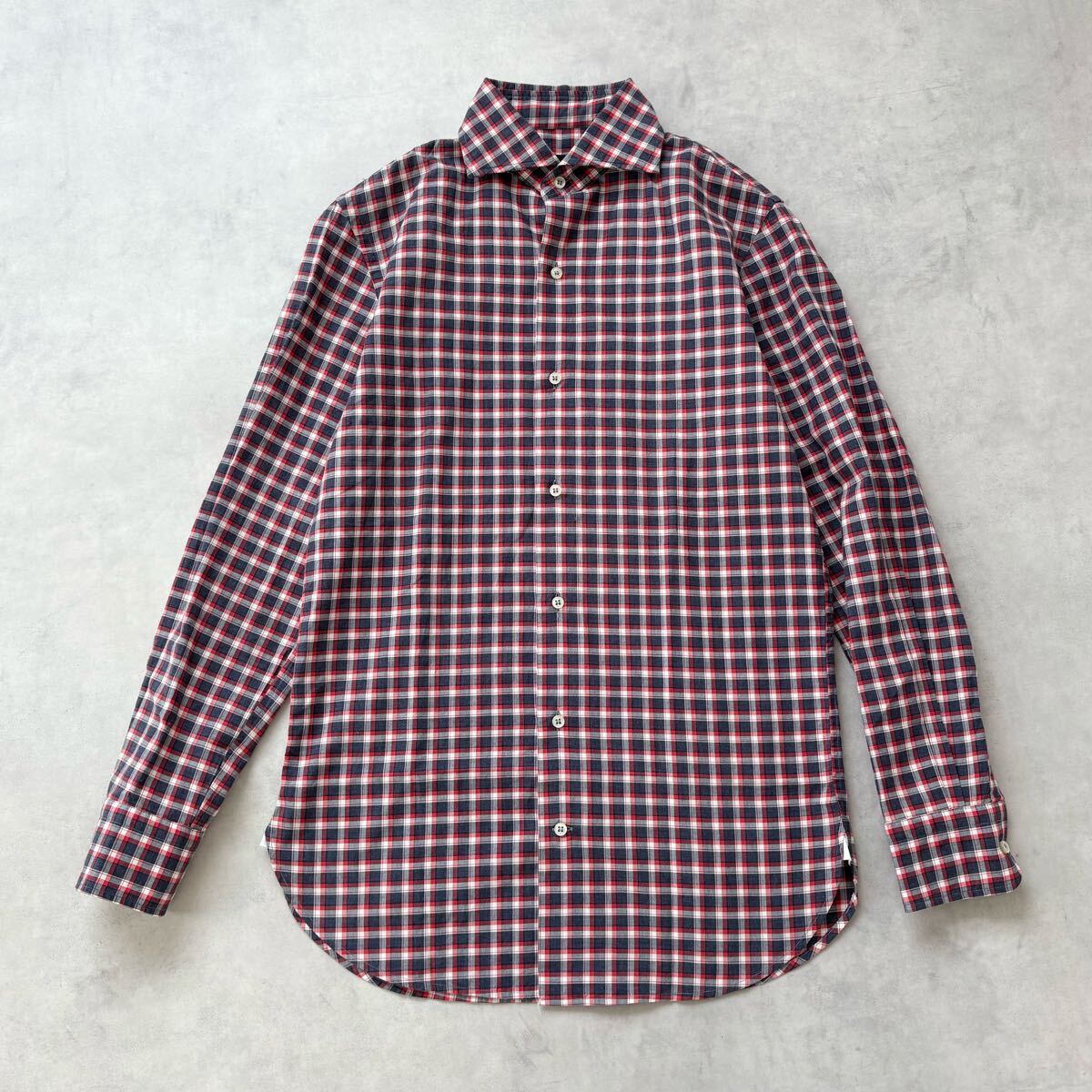 イタリア製 GUY ROVER ギローバー 長袖 コットン ホリゾンタルカラー チェック シャツ 裾ガゼット メンズ(S) 紺 赤 / a-310