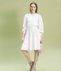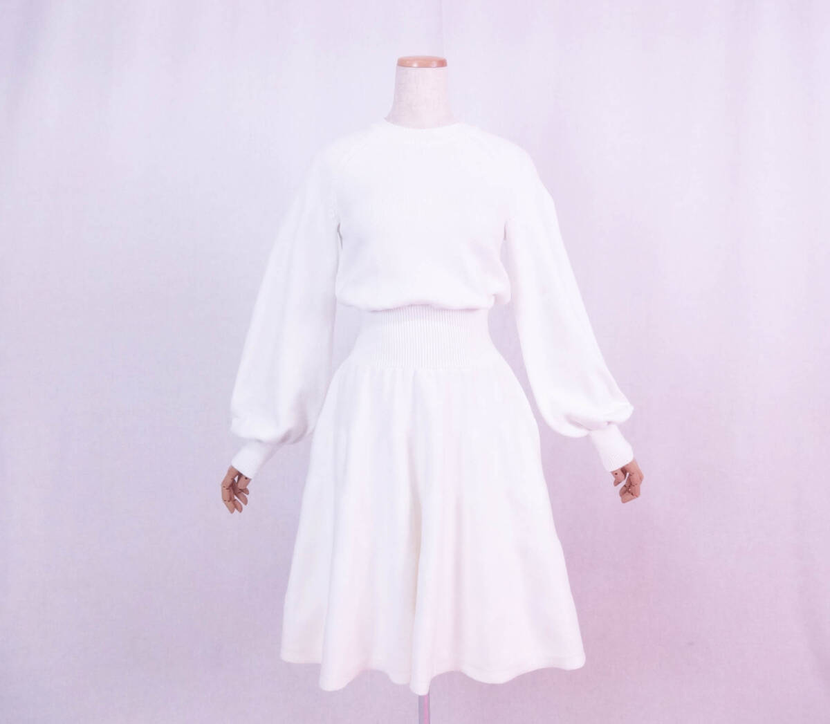 ウエストのリブがフィットアンドフレアのシルエットを作り出す、エレガントなシルエットのニットワンピース