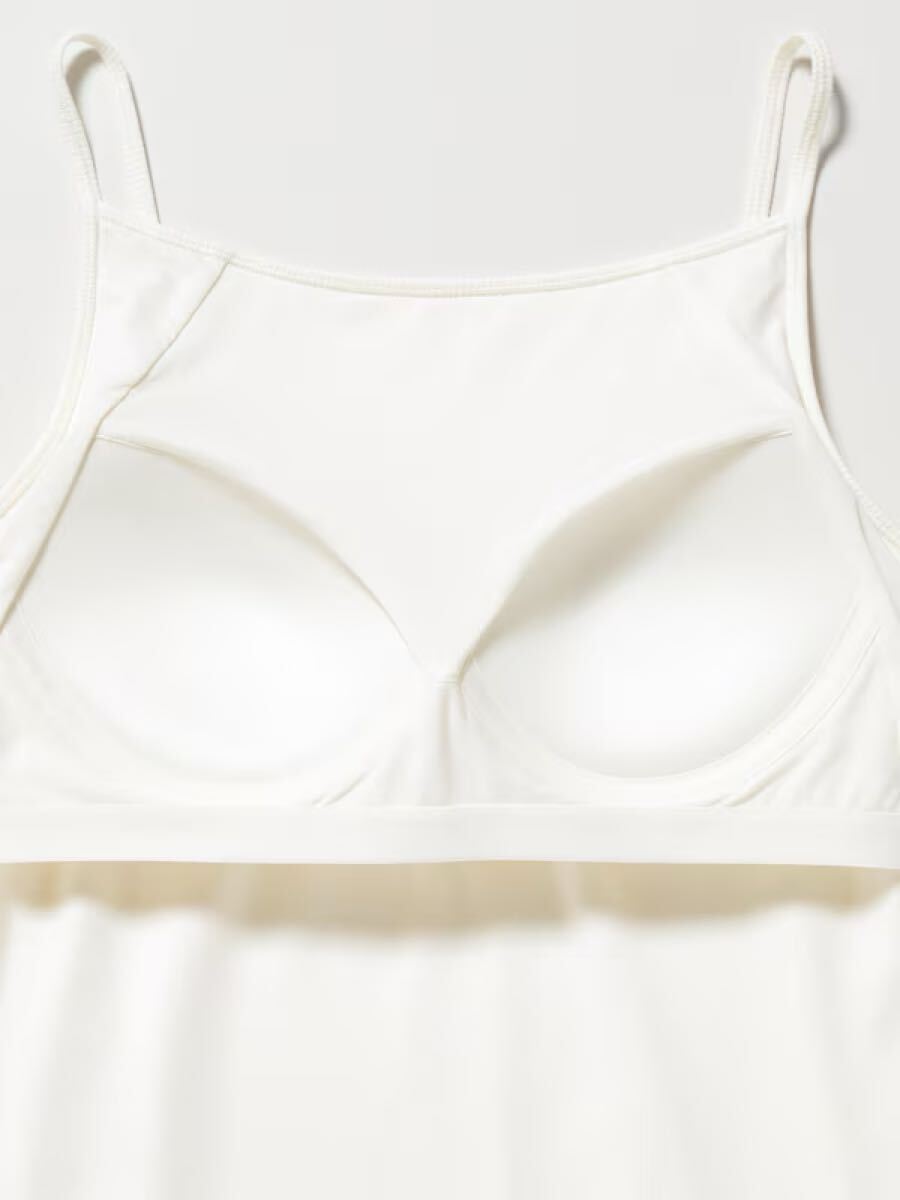 - 胸元は高めで安心感がありながら、背中が開いたデザイン。