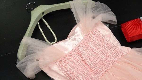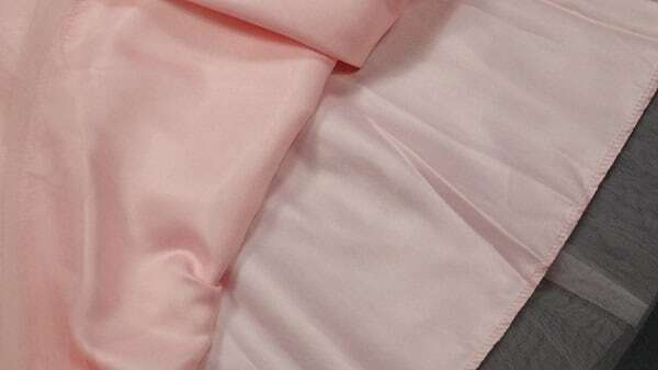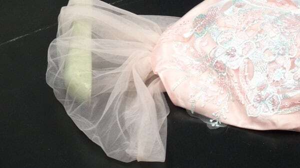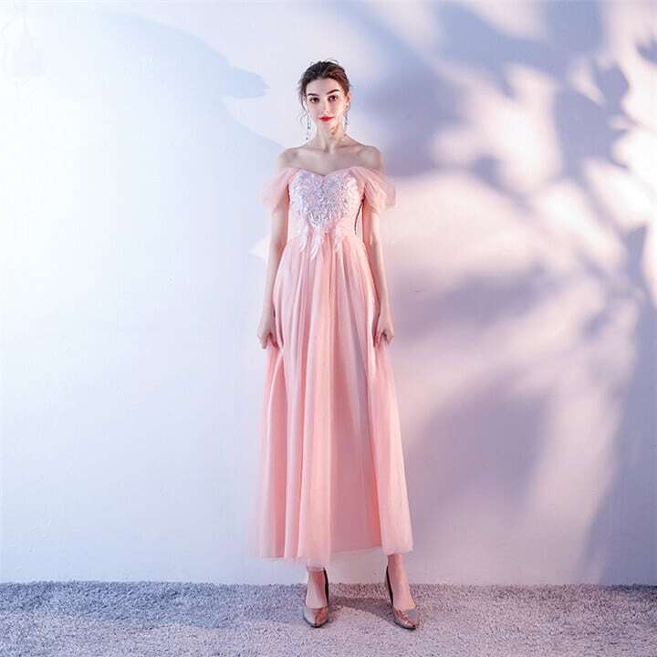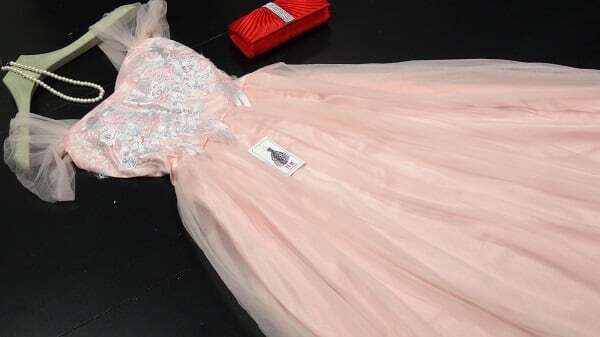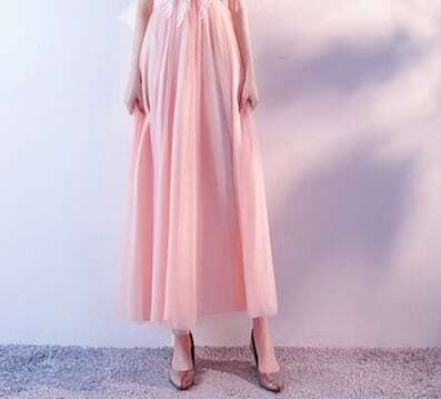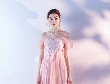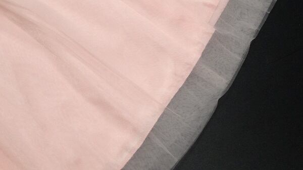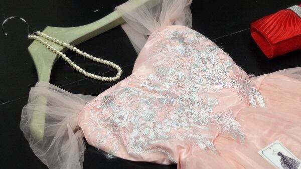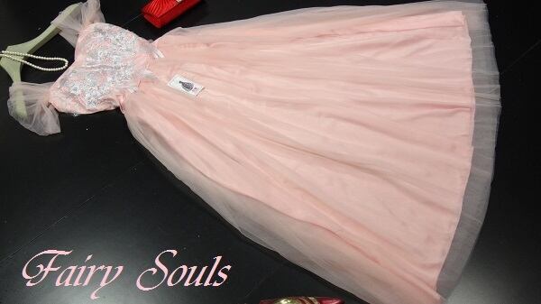 チュールオフショルダーのパ-ティ-ドレス。ピンクのサテン地の上に同色のチュールを重ねて豪華な雰囲気に。トップス部分はチュール地に刺繍とビーズパールをあしらい、袖はチュールをドレープ状にたばねたオフショルダータイプ。デコルテから肩にかけてのラインが美しくみえるデザインです。また背中部分がシャーリング仕様になっているので、伸縮性があり動きやすくなっています。パーティやイベント、結婚式など、様々なシーンで、気品のある印象を与えてくれる一枚です。裏地なし(サテン地の上にチュールをかぶせています)。背中シャーリング仕様。右脇ファスナ-有。胸パット付き。