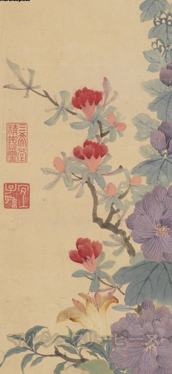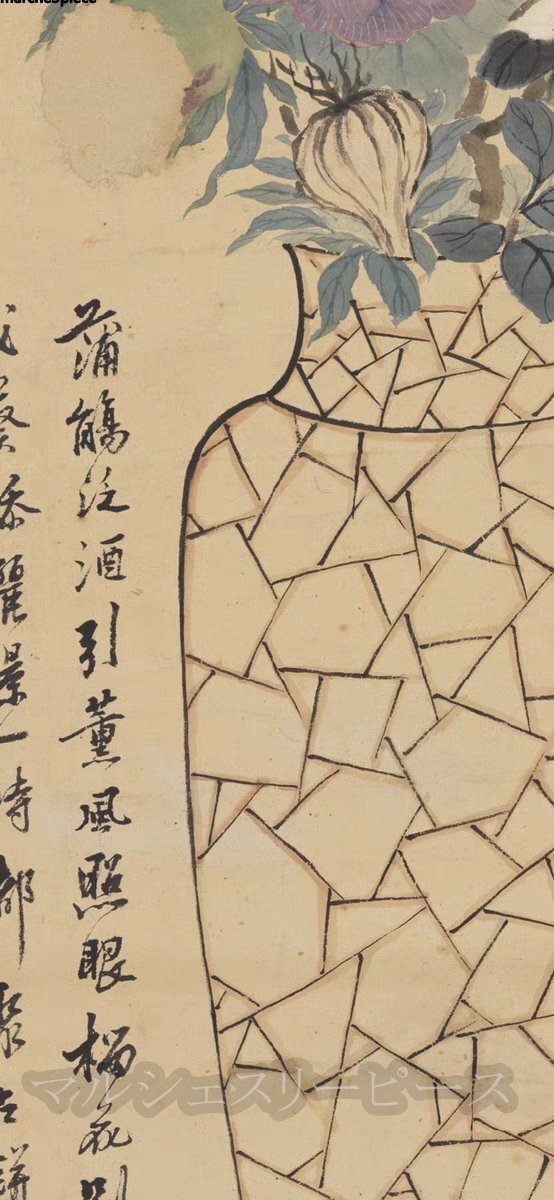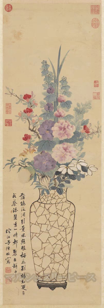明時代 陳筆『端陽景図』 古代端午節 草花と花瓶 国画掛け軸・縦幅(高精細インクジェット複製・画芯 未表装)