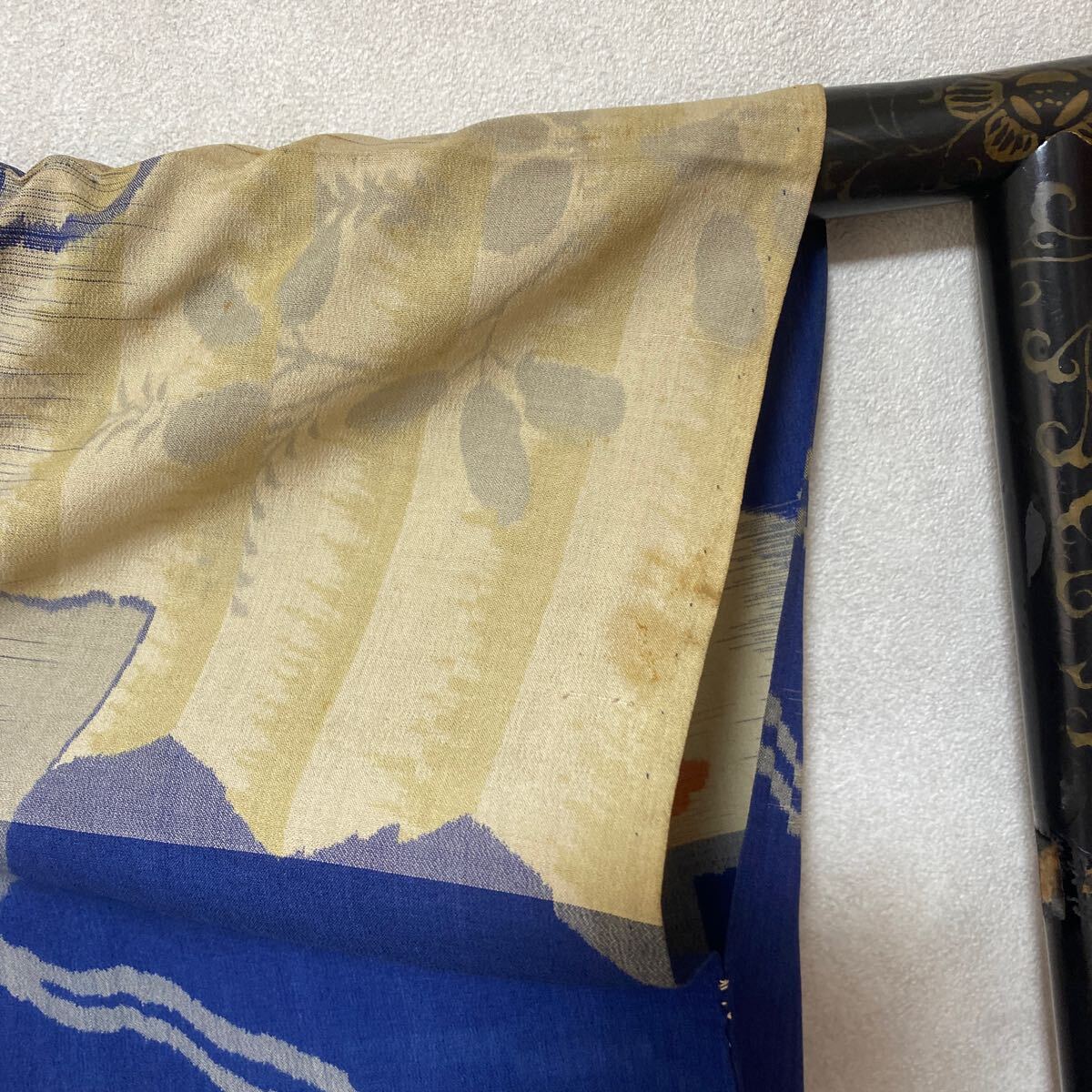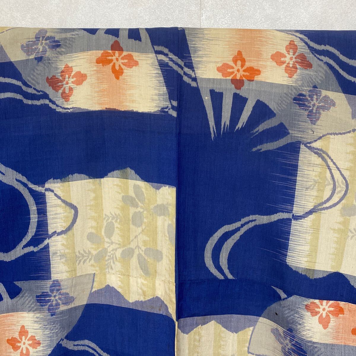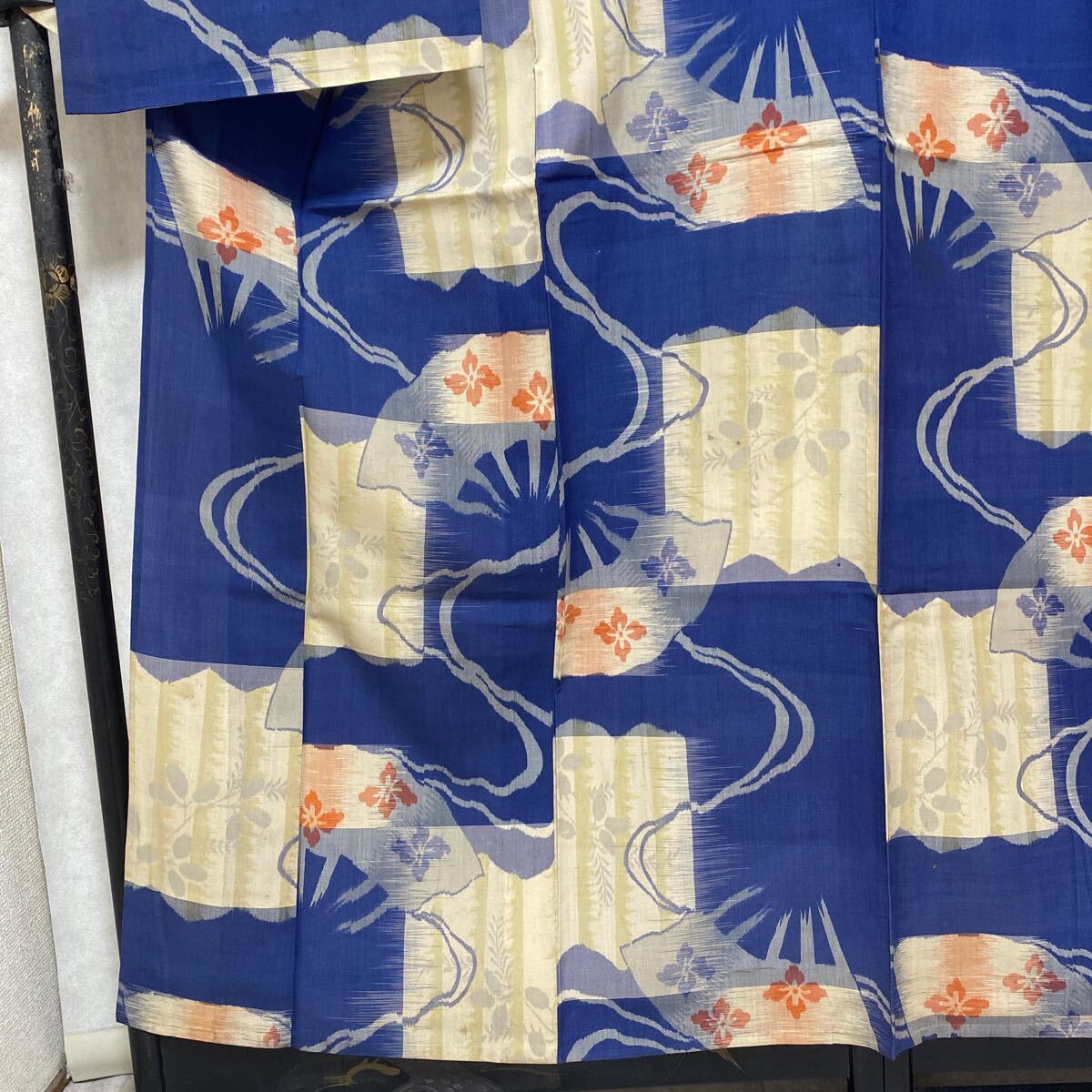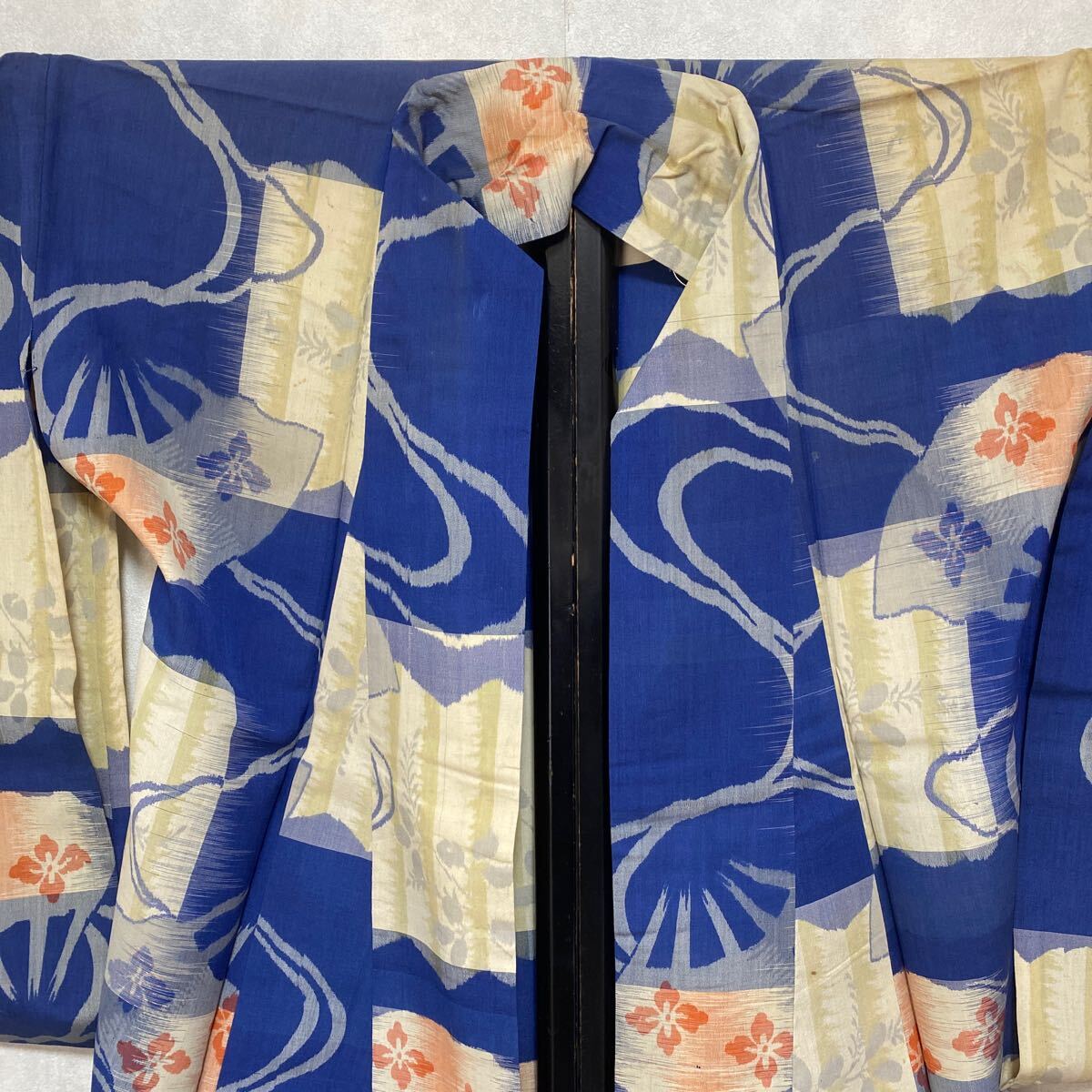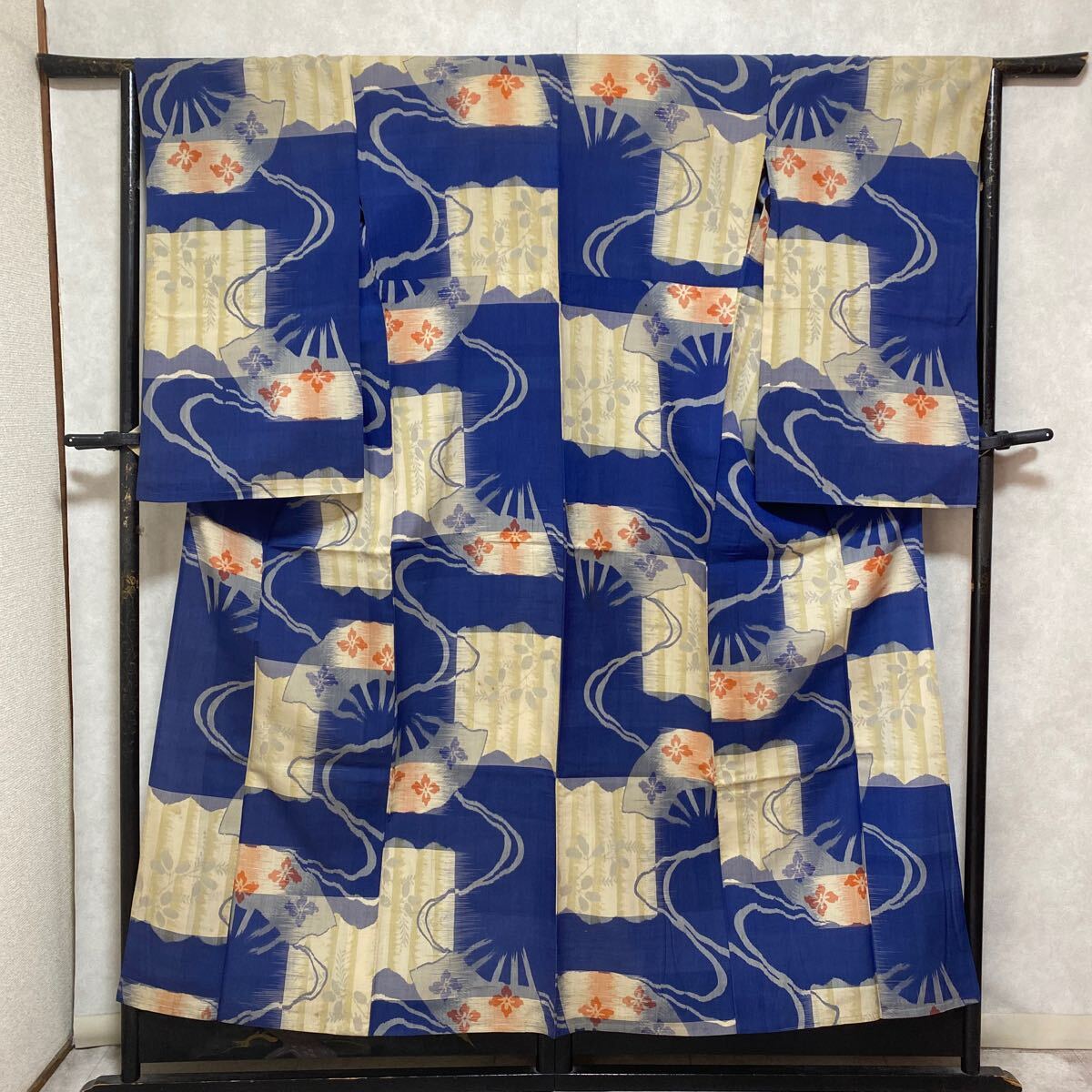 アンティーク 単衣 絽 紗 夏物 着物 正絹 昭和レトロ 大正ロマン モダン 和洋折衷コーデ リメイク 青 扇 花 か05-4w