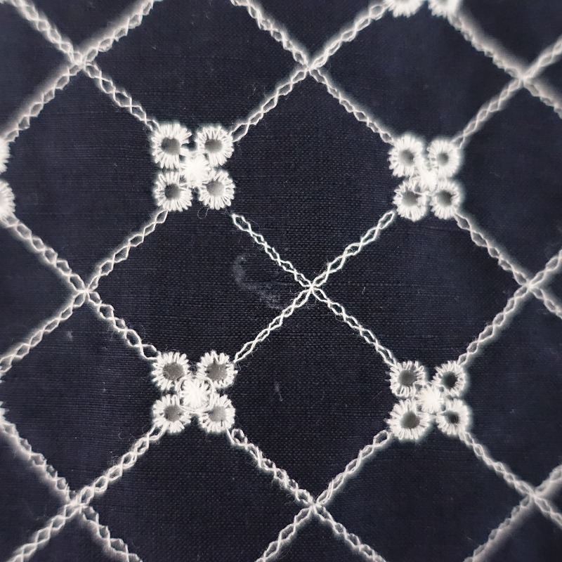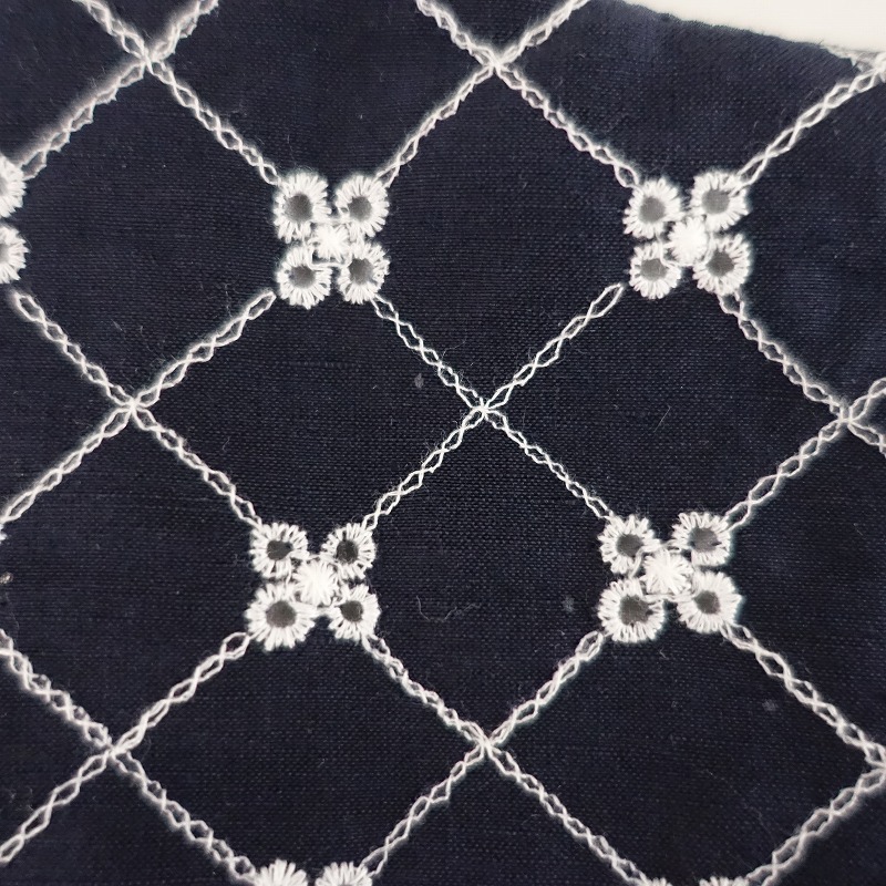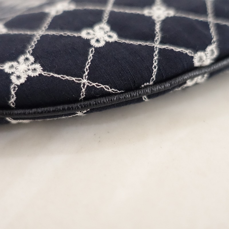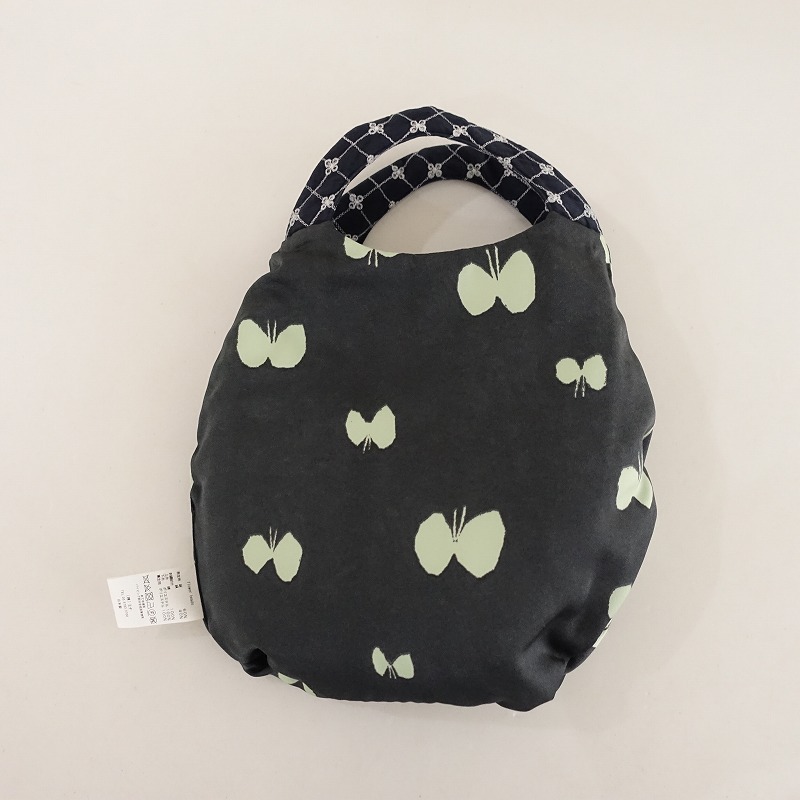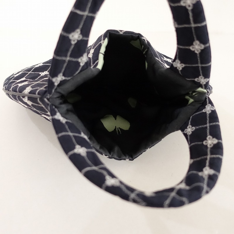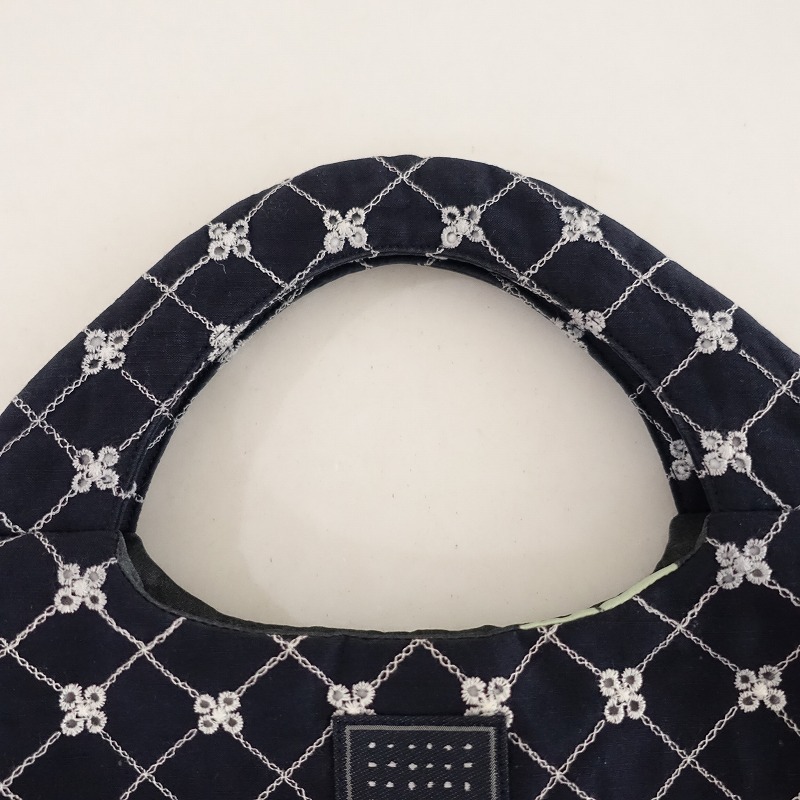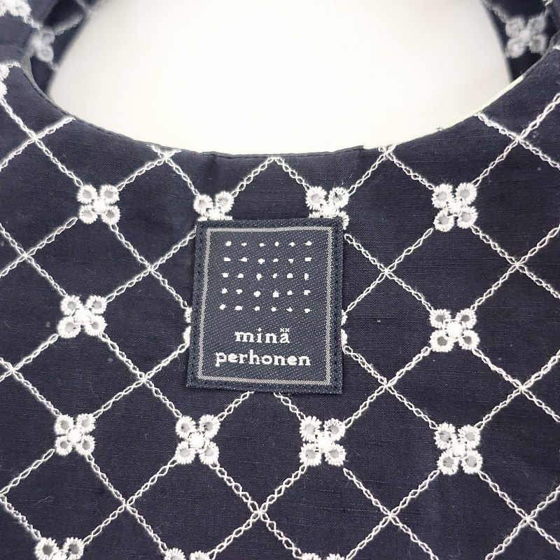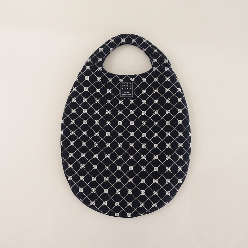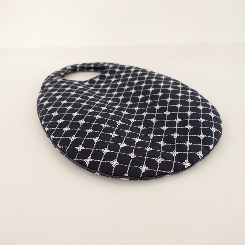 | mina perhonenのflower beads egg bagです。カラーはダークネイビー×ホワイトで、「flower beads」のテキスタイル刺繍が施されています。サイド周りはパイピングが施されています。内側は光沢のあるブラックベースで蝶々柄の裏地付きで、素材は表地が麻60%、絹40%、裏地がポリエステル100%、パイピング部分が人工皮革です。 |
