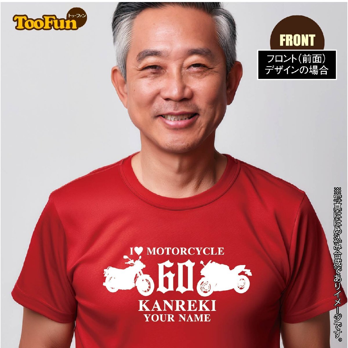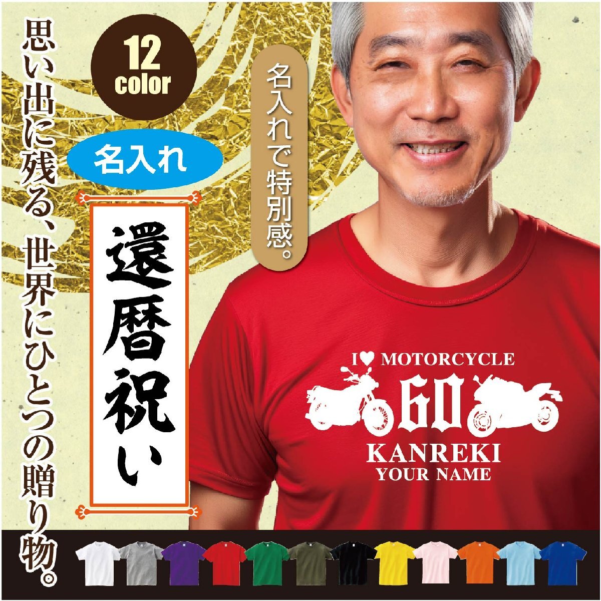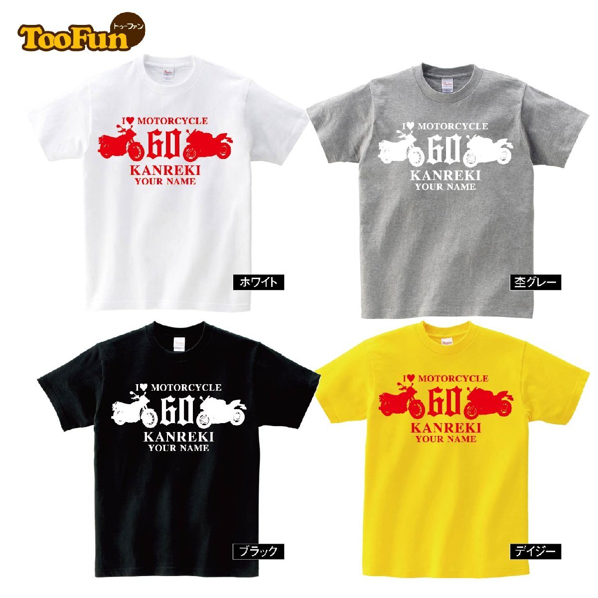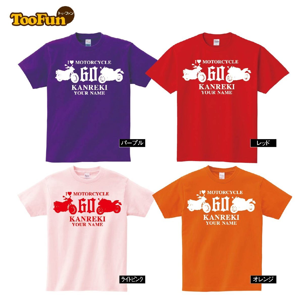 バイク、ツーリングのシルエット、還暦のお祝いとして名入れができる半袖Tシャツです。お色が12色、サイズも15サイズとお子様から大人までお揃いでも着用ができる仕様です。