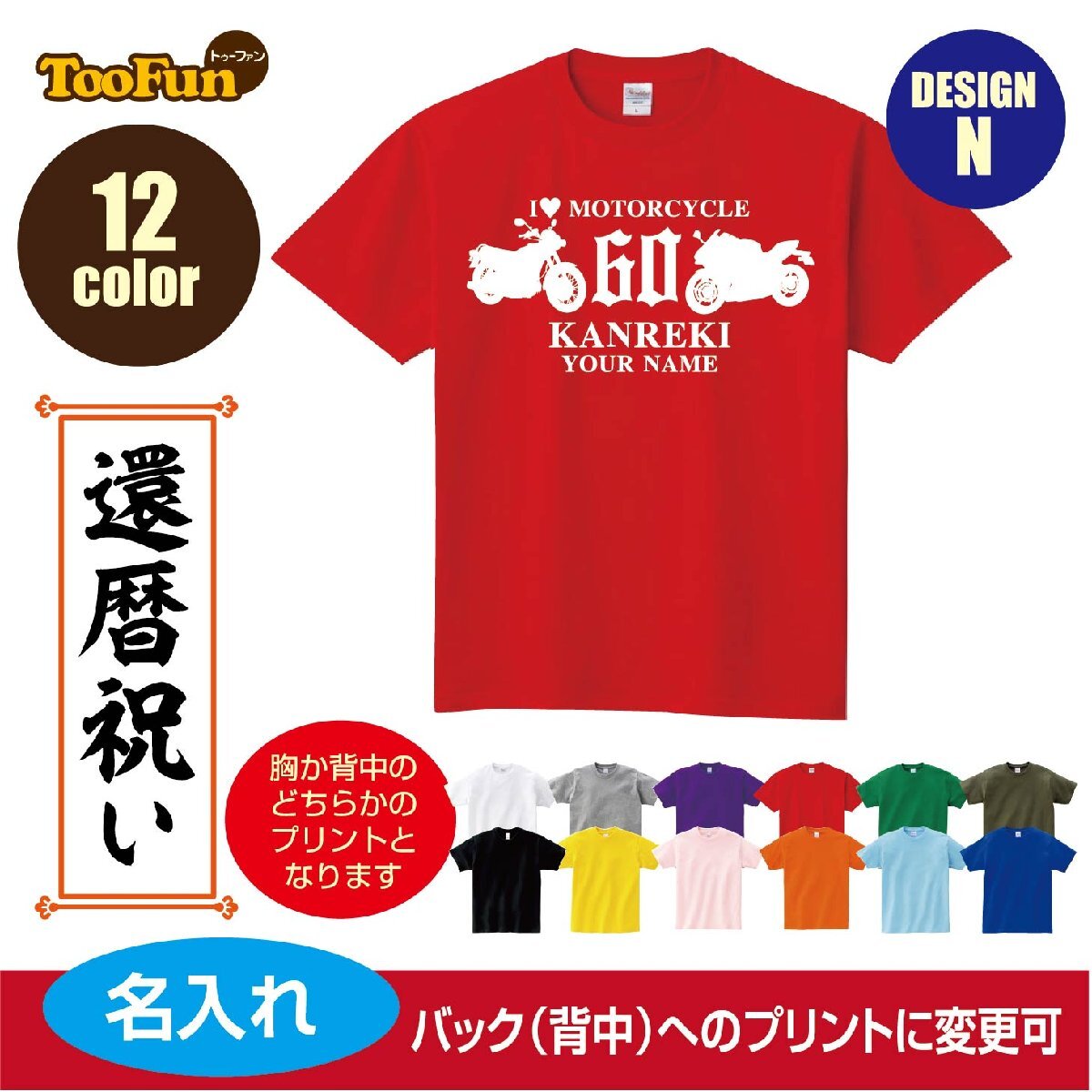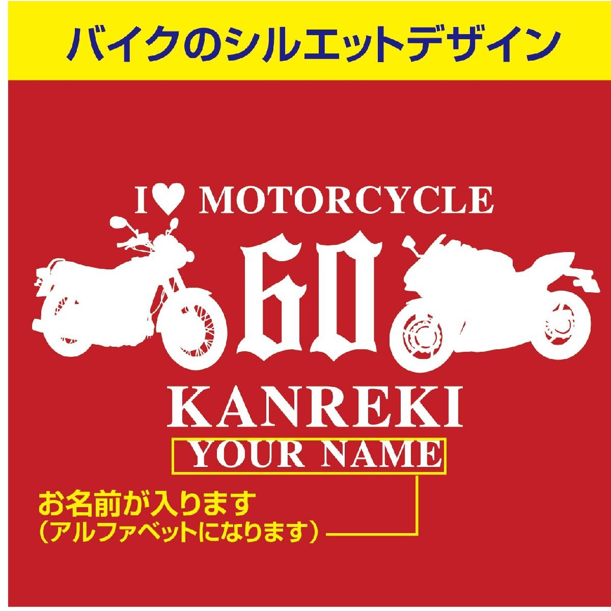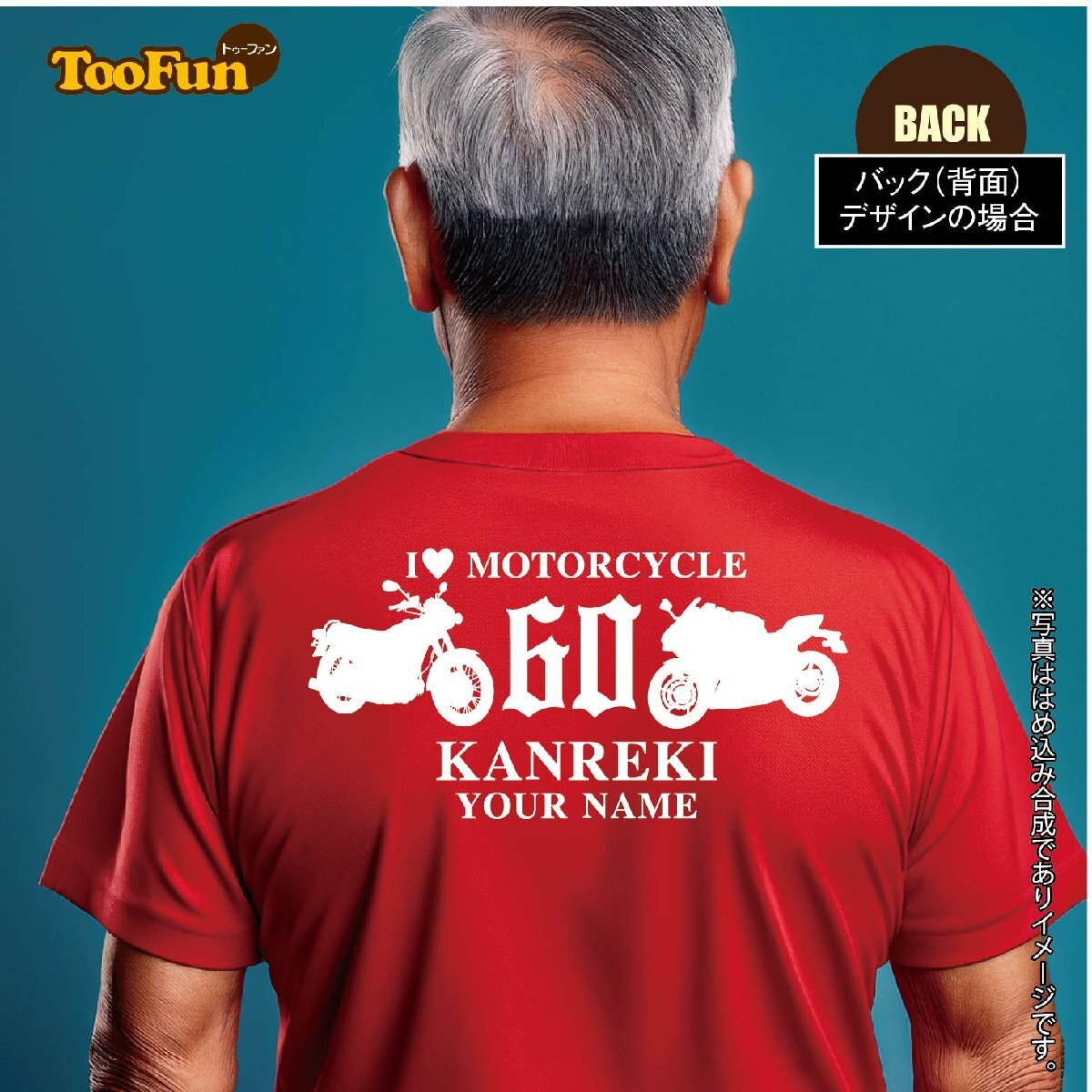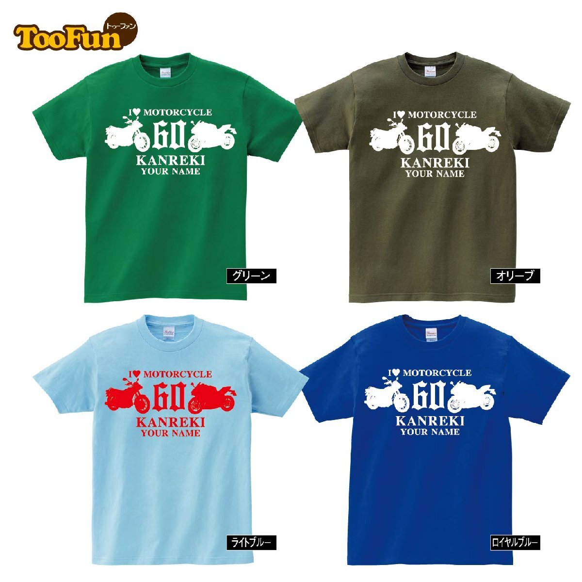 バイク、ツーリングのシルエット、還暦のお祝いとして名入れができる半袖Tシャツです。お色が12色、サイズも15サイズとお子様から大人までお揃いでも着用ができる仕様です。