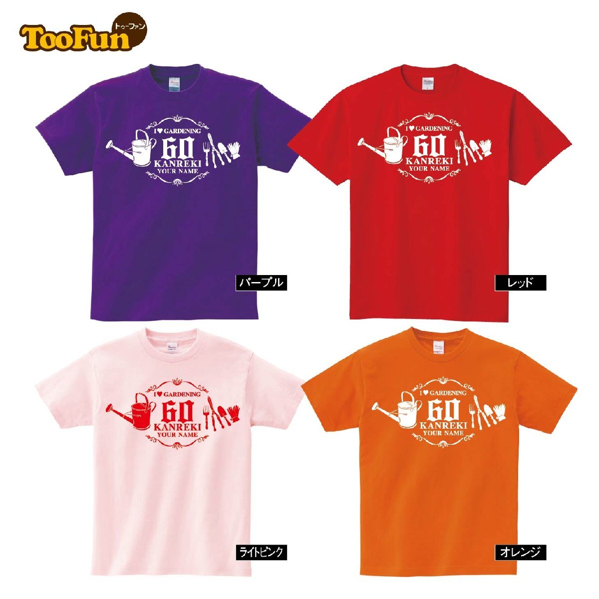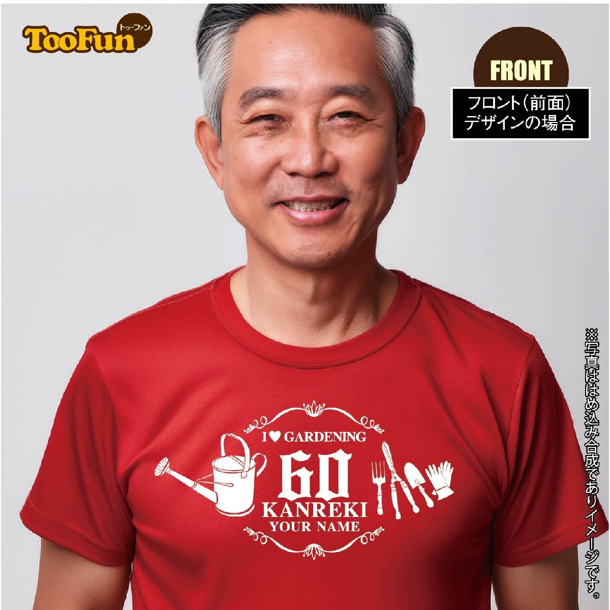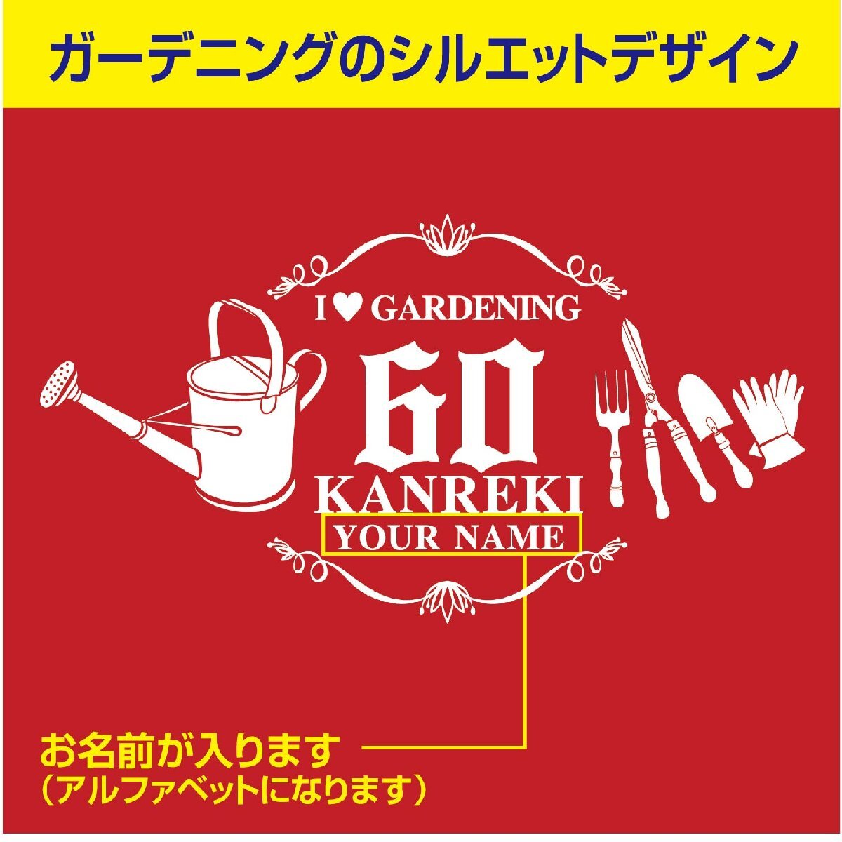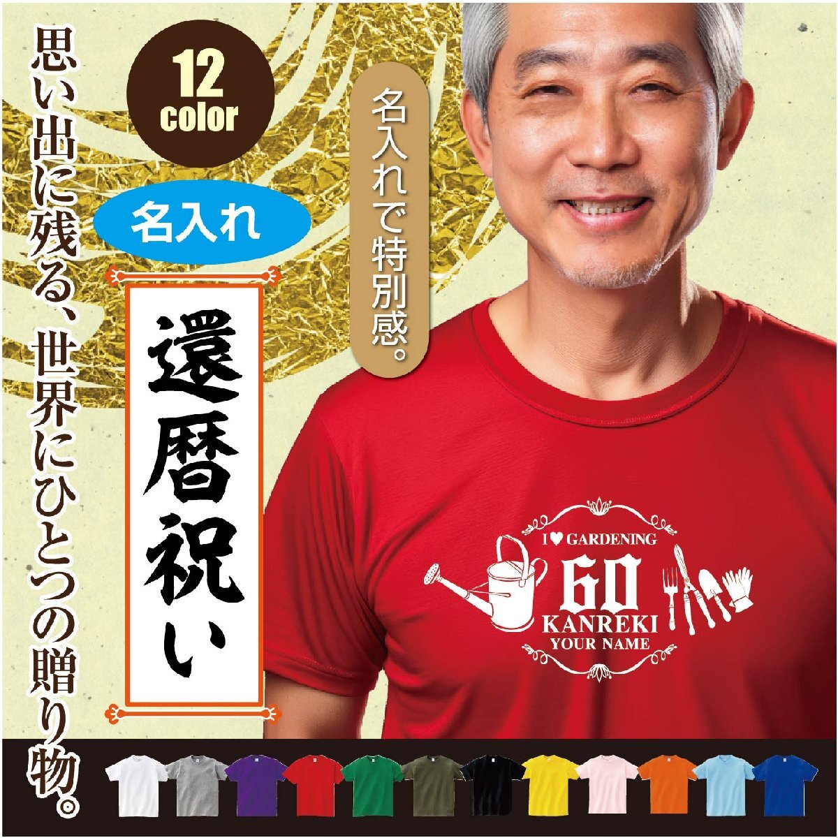 ガーデニングのシルエット、還暦のお祝いとして名入れができる半袖Tシャツです。お色が12色、サイズも15サイズとお子様から大人までお揃いでも着用ができる仕様です。