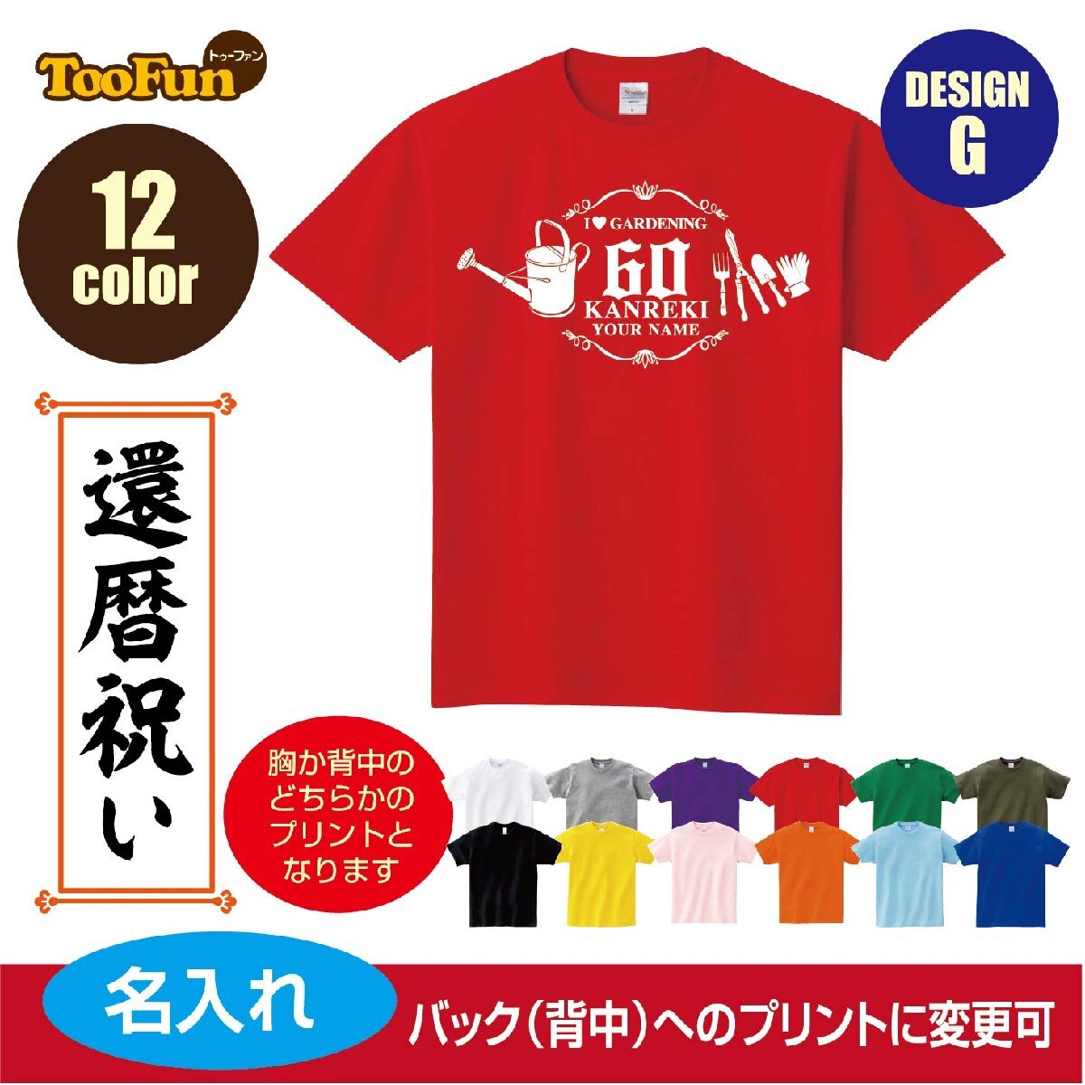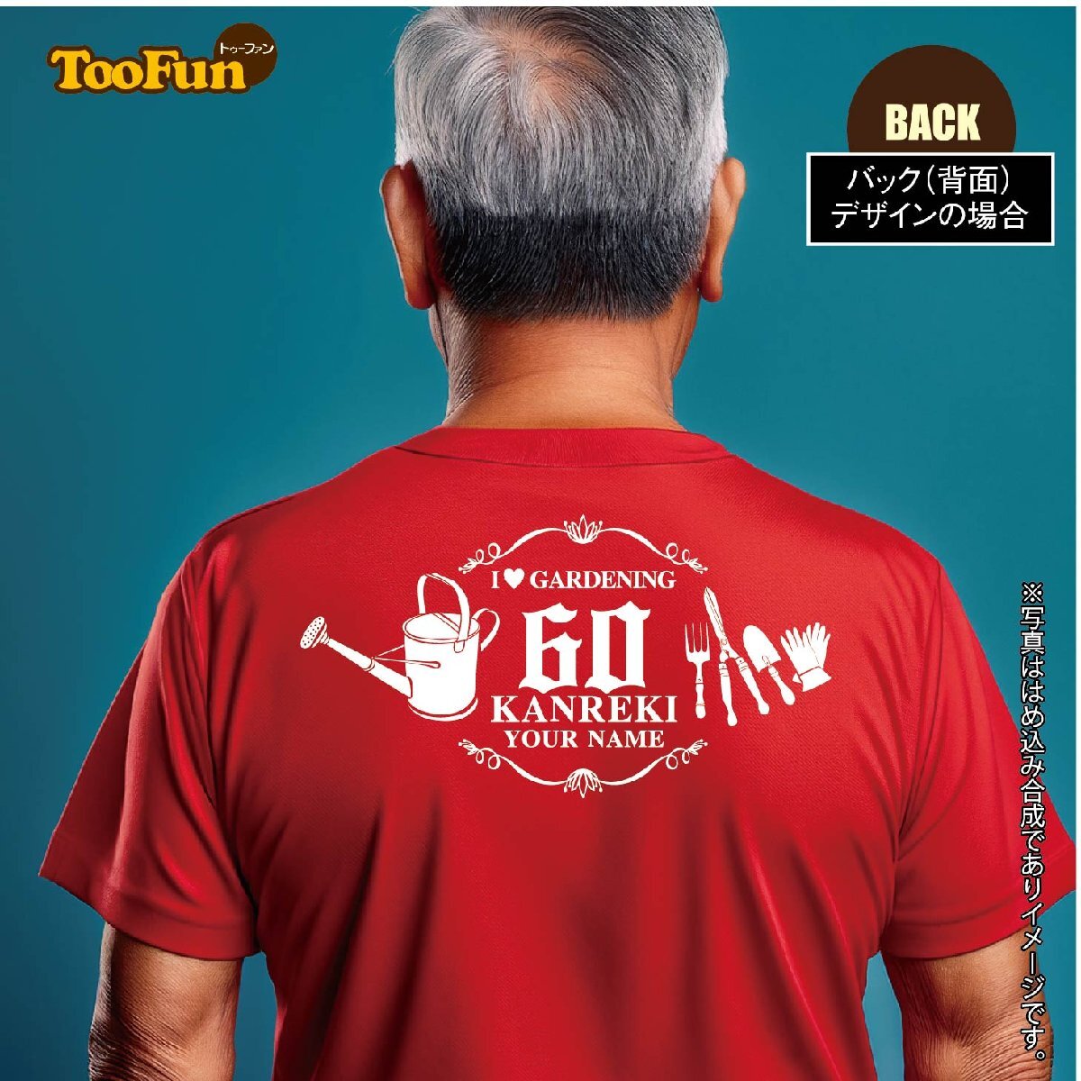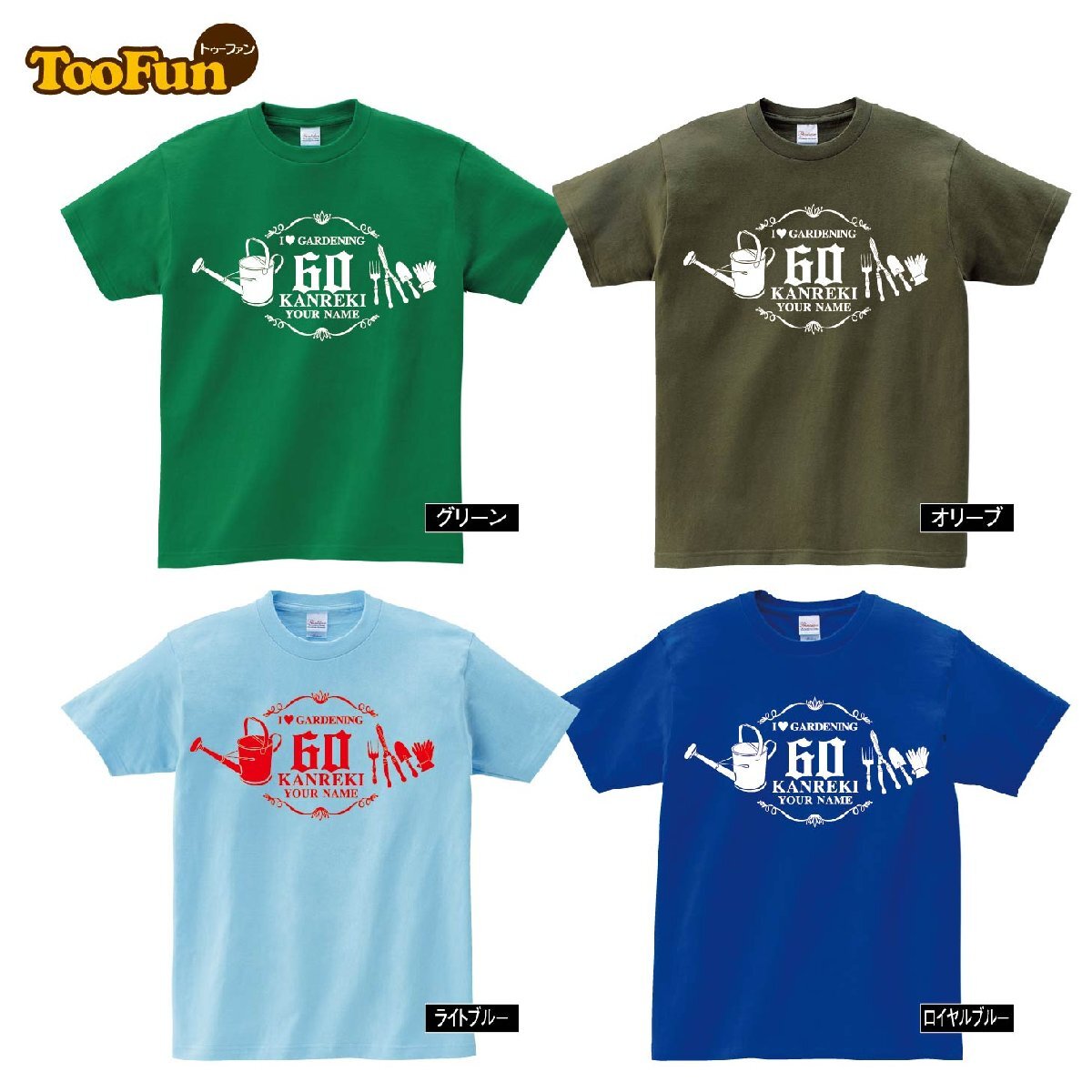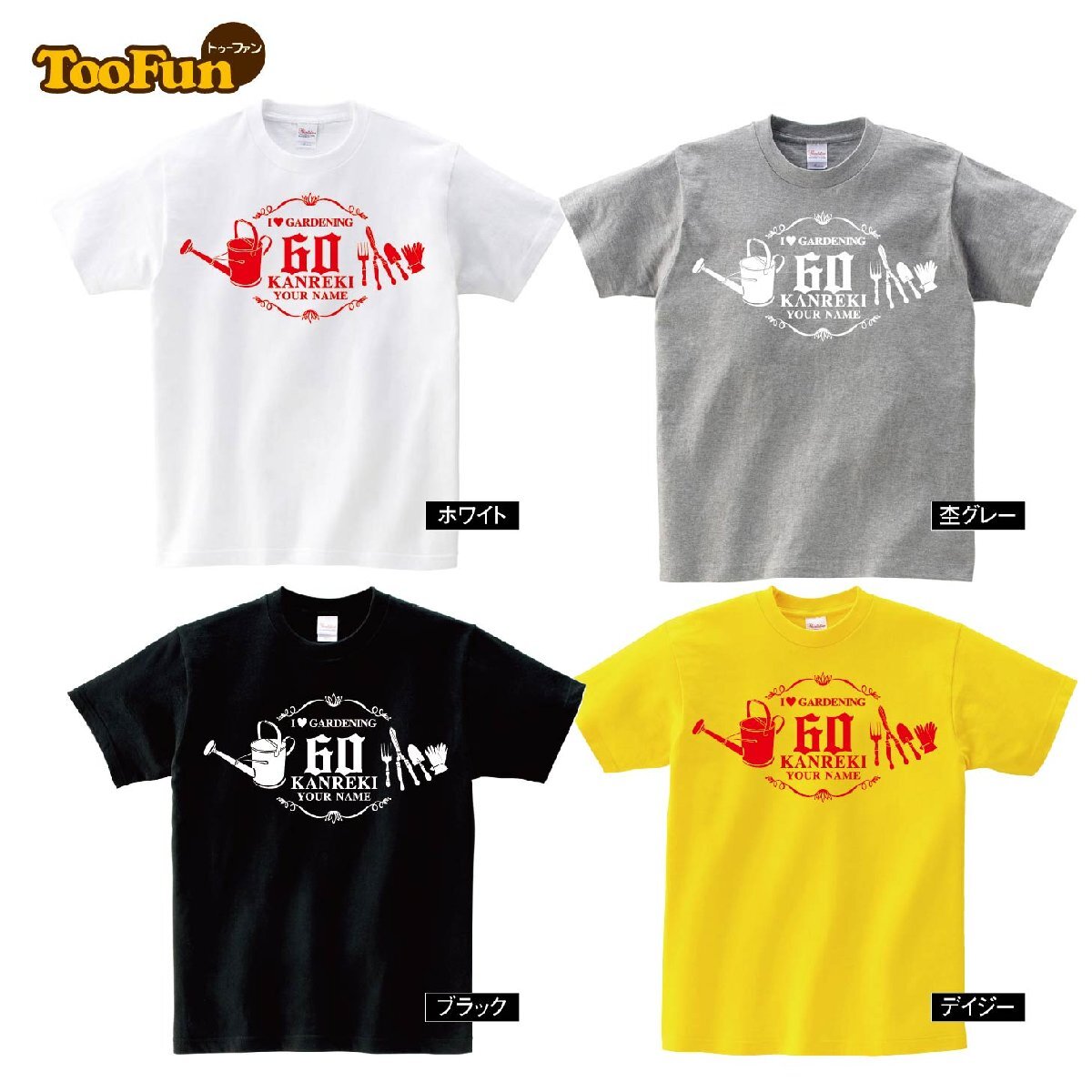 ガーデニングのシルエット、還暦のお祝いとして名入れができる半袖Tシャツです。お色が12色、サイズも15サイズとお子様から大人までお揃いでも着用ができる仕様です。