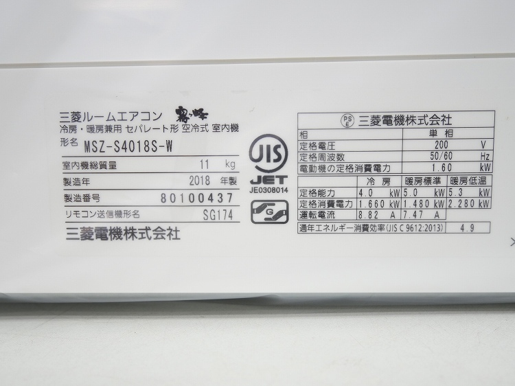 【未使用品】【室内機のみ】三菱製/ルームエアコン/14畳用/MSZ-S4018S-W(7051673)