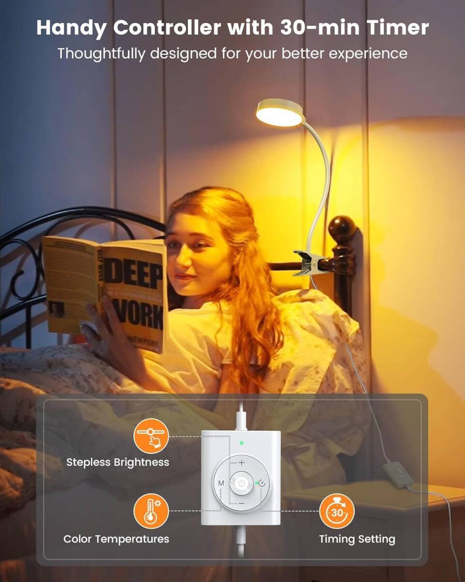 耐久性に優れたクリップ(開口部約6.9cm)と滑り止めパッドを搭載し、デスク、ヘッドボード、寮のベッドなどにしっかり取り付け可能。傷を付ける心配もありません。ベッドライト、クリップライト、調光可能な読書灯、作業用ライトなど、幅広い用途に対応。便利なコントローラーと30分自動オフタイマー機能も搭載し、快適な読書タイムをサポートします。