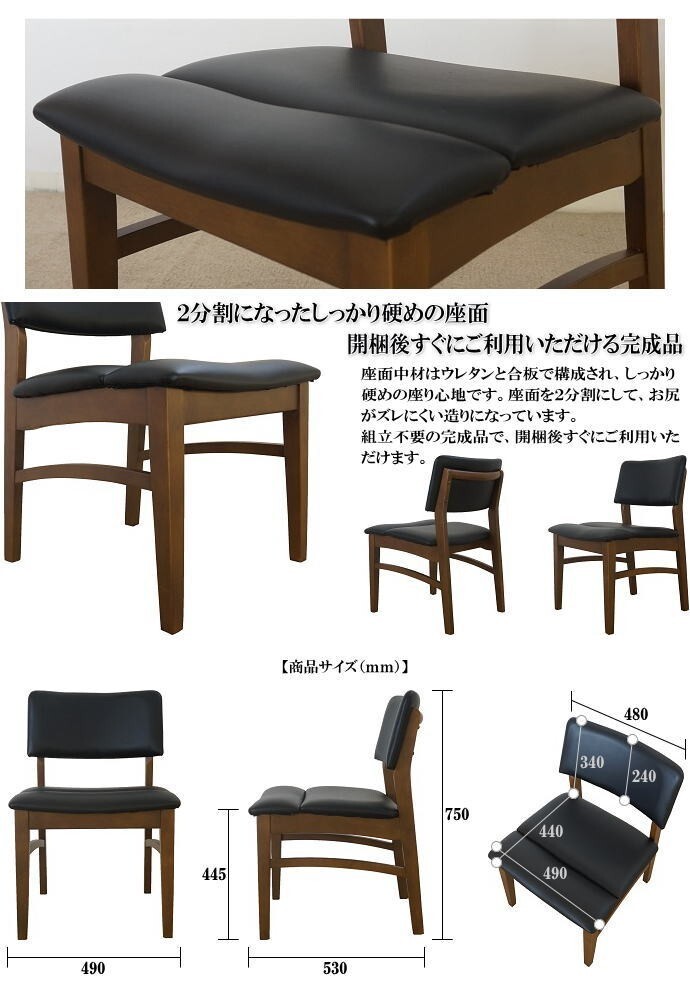 | 【商品特徴】 | ◇ナチュラルモダンスタイルの49cm幅合成皮革張チェアーの2脚セット販売です。 ・ラバーウッド無垢材を使用した脚部・フレームとモダンな印象を持たせてくれる合成皮革(PVCレザー)の張地で、ナチュラルモダンテイストのお部屋づくりに最適です。 ・背もたれを湾曲させて、背中をしっかりとサポートするフィット感ある掛心地です。 ・座面を2分割にして、お尻がズレにくい造りになっています。 ・ウレタンと合板で構成された中材で、しっかり硬めの座り心地です。 ・組立不要の完成品で、開梱後すぐにご利用いただけます。 | |