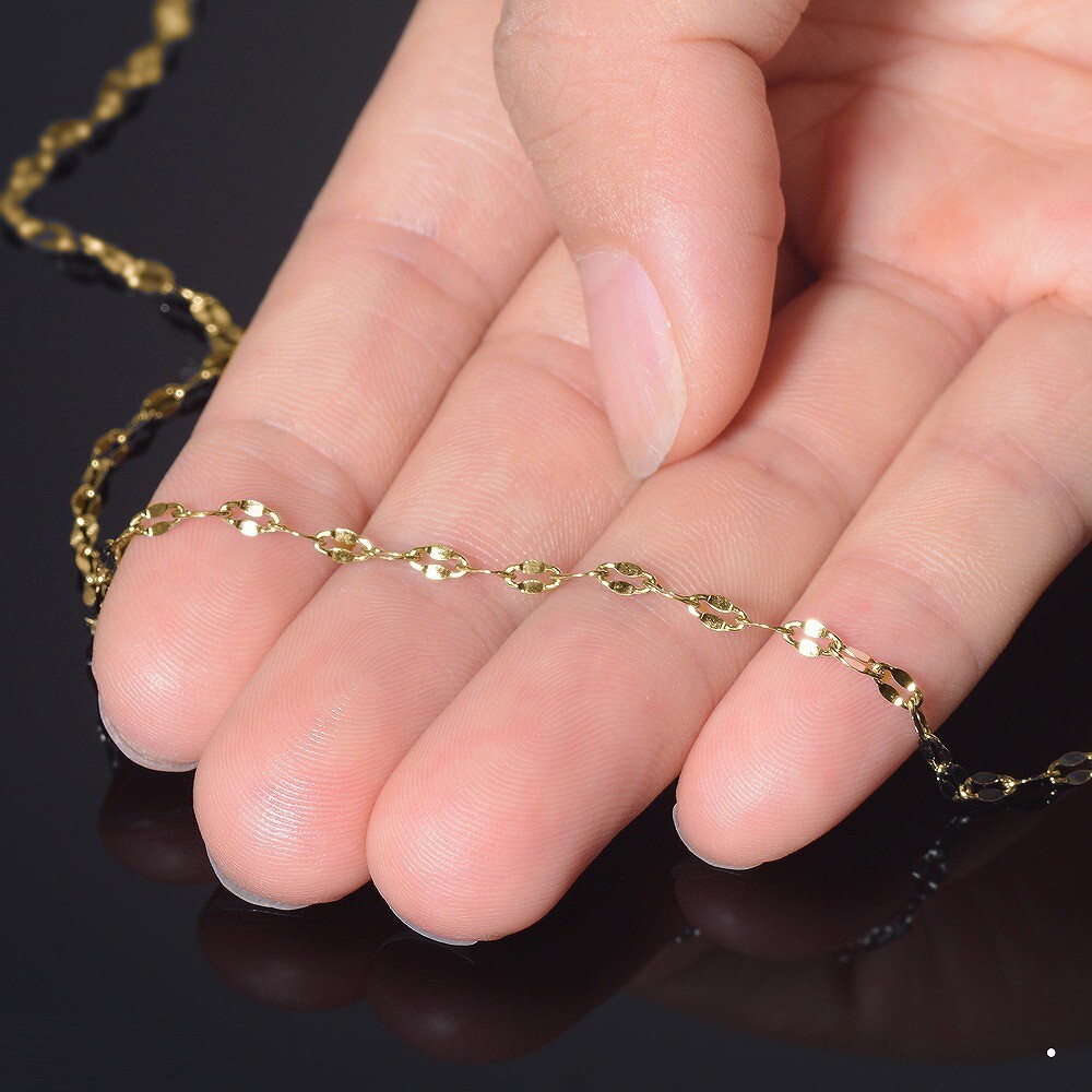 コマの中央部分が平たく押しつぶされたようなフラットなデザインのチェーン。潰れた部分がキラキラと輝くきれいなネックレスです。 ※イオンプレーティング(IPメッキ)とは、金属イオンと不活性ガスを反応させた化合物を製品に蒸着させるコーティングで、ガスの比率でカラーを調整します。従来の鍍金加工に比べて表面耐久性、密着性、工程の安全性が飛躍的に向上しております。 |