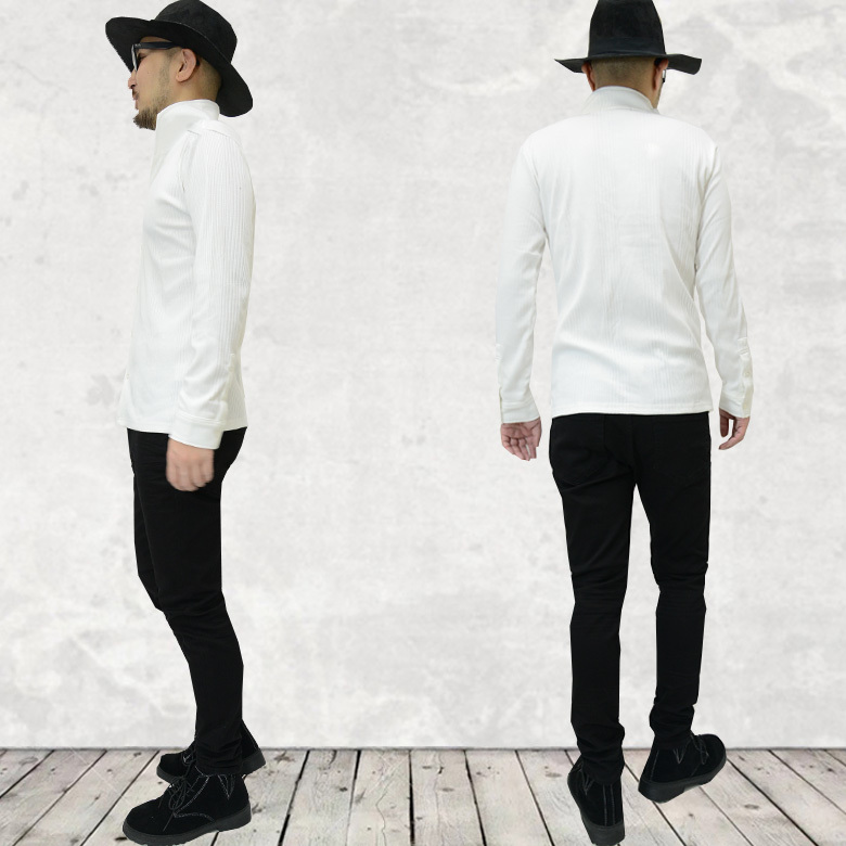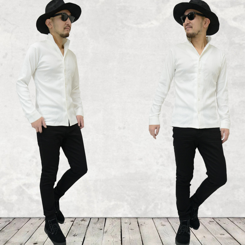 新作【衿ワイヤーストレッチ素材ランダムテレコイタリアンカラー長袖シャツ】が登場。