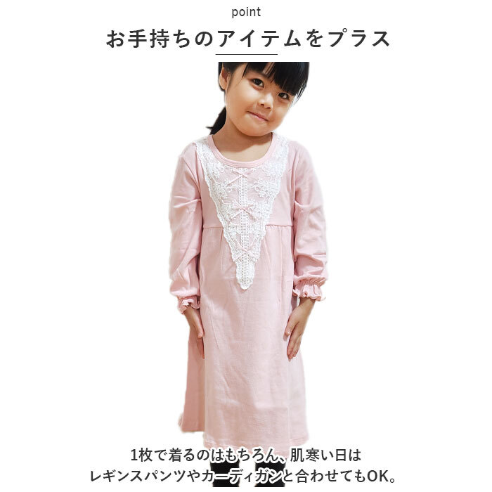 | 商品説明 | ・・女の子らしさがギュッと詰まった、キッズ用ルームウェアが登場。 ・【ワンピースタイプ】 ・お家の中でも可愛くいたいガールズにぴったりな、ワンピースデザイン。 ・【お手持ちのアイテムをプラス】 ・・1枚で着るのはもちろん、肌寒い日はレギンスパンツやカーディガンと合わせてもOK。 ・【可愛らしさ満点】 ・フロントにレース刺繍やリボンを取り入れた、とってもキュートなデザイン♪ ・【着脱ラクチン】 ・頭からすっぽり被るだけだから、お子さま1人でもお着替えできちゃう! ・【心地良いフィット感】 ・袖口にフィットするゴム入りで、手元の動きを妨げない◎クシュッと感のあるメロウデザインもアクセントに。 ・【選べるカラー&サイズ】 ・お好みや成長に合わせてチョイス。姉妹お揃いコーデもおすすめ。 |
