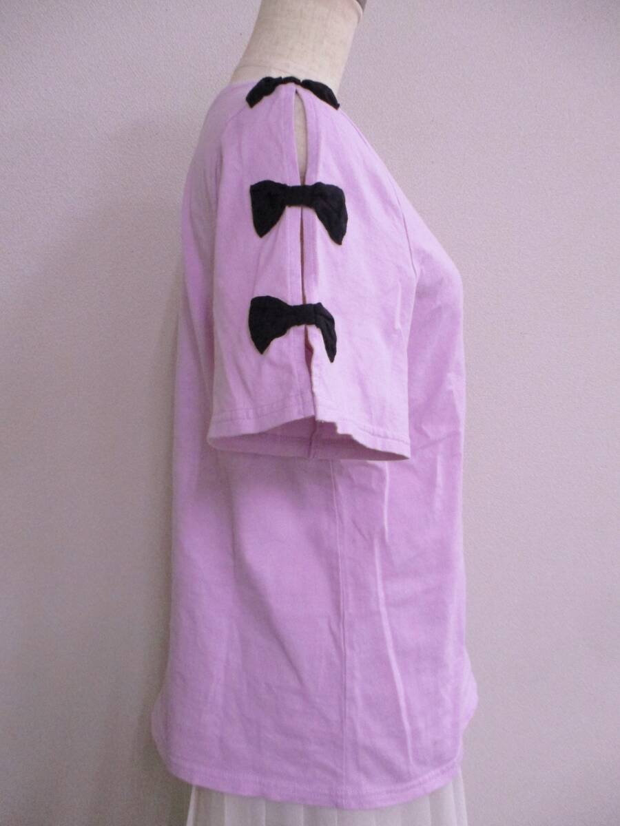 ☆2200【送料無料】mezzo piano junior メゾピアノジュニア トップス 半袖Tシャツ L 160 ラベンダー 肩リボン スリット ラメプリント 刺繍