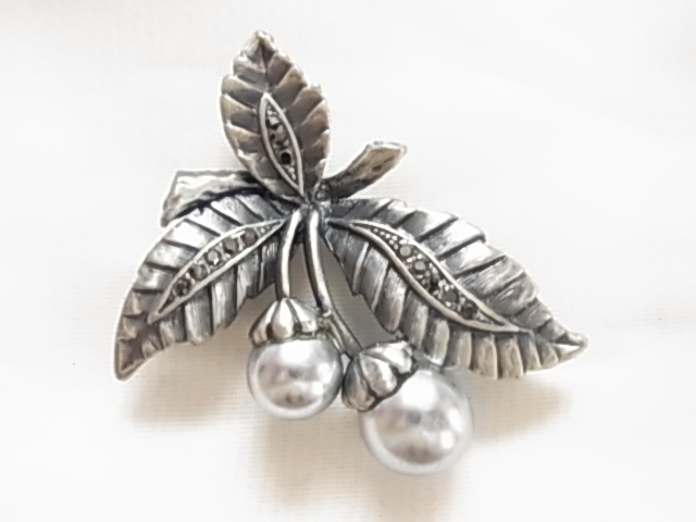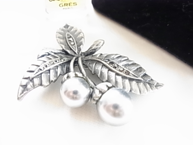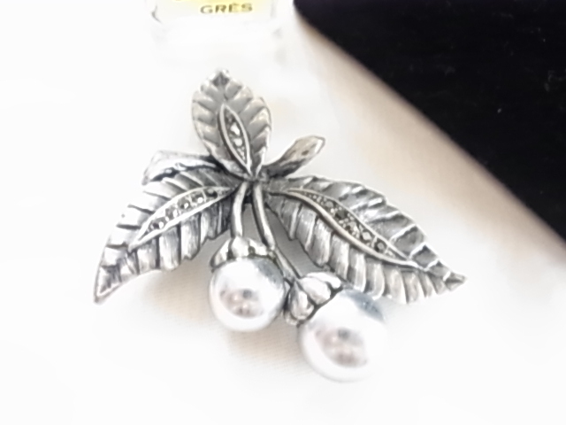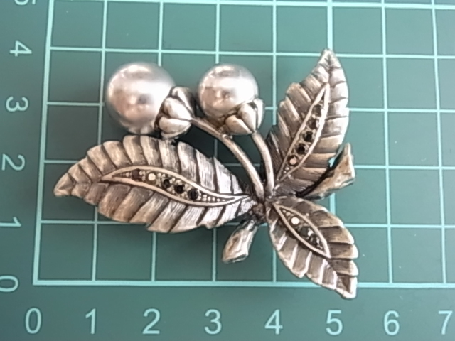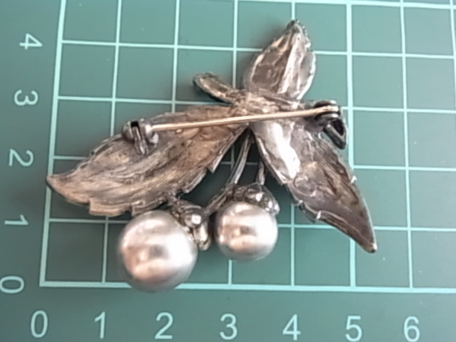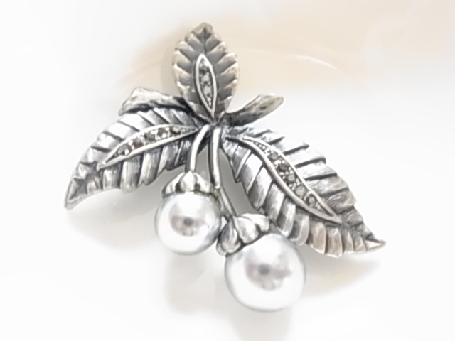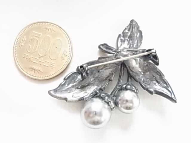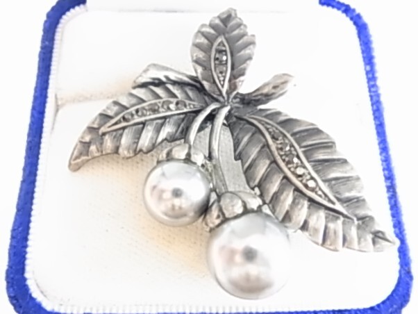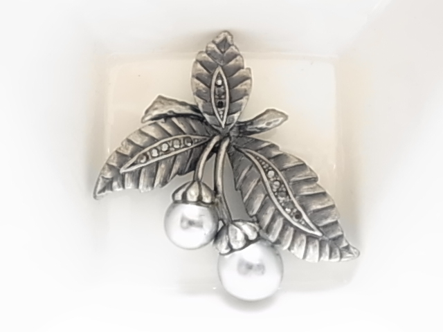 ■ビンテージ/ヴィンテージ アンティークシルバートーンのリーフと実のデザイン グレーパールトーンの珠と銀系ストーン付きのブローチ