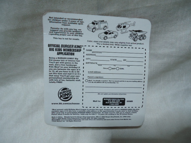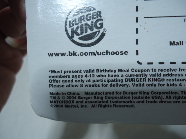 米国にて、個人の方より、購入しました。2004年製。新品デッドストック未開封物ですが、多少パッケージ損傷あります。米国バーガーキング・マッチボックス製。スチール・プラスチック製。サイズは、全長約8センチです。24時間以内に、お手続き入力後、期限内にかんたん決済、出来る方のみ、ご入札をお願い致します。この商品は、1点物です。 ※※発送方法・送料は、特定記録付き定形外郵便(追跡可能・補償無し)ですと、500円又は、レターパックプラス郵便(追跡可能・手渡し配達・補償無し)ですと、600円又は、簡易書留郵便(追跡可能・手渡し配達・補償有り)ですと、640円です。※※ ☆★★★★★☆送料は、変わりますが、何点でも、同梱包可能です。数点落札されましたら、まとめて取引を、選択お願いします。☆★★★★★☆