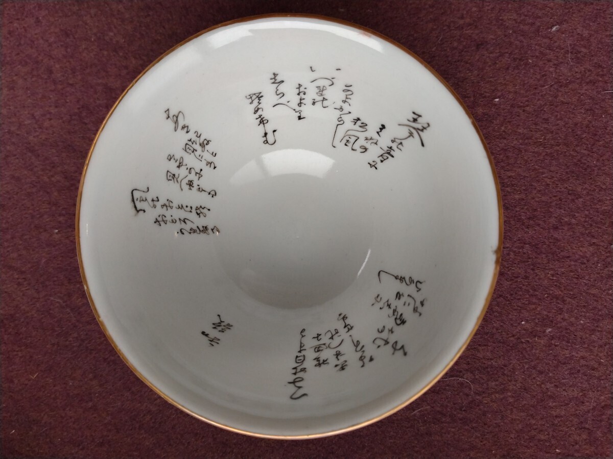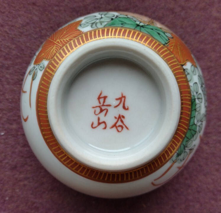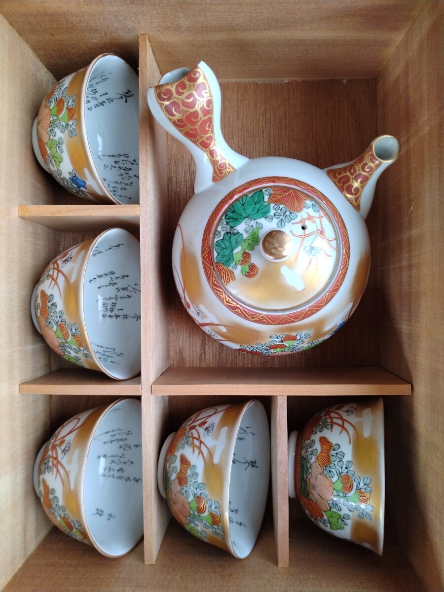 九谷焼:金彩の番茶器揃、同じ意匠の岳山窯の職人の大量生産ではなく、岳山の手による作家物で昭和期の旧いものです。箱書きに「岳山」とのみの落款からそれが判ります。窯職人によるものは「岳山窯」と表記されるのが慣わしです。また、その箱書き書風からも判ります。コレクター放出品の未使用ですが、数十年の経年により木箱のヤケや汚れがあります。茶器にはヒビやカケは見当たらず美麗ですが、経年骨董品ということをご諒承ください。