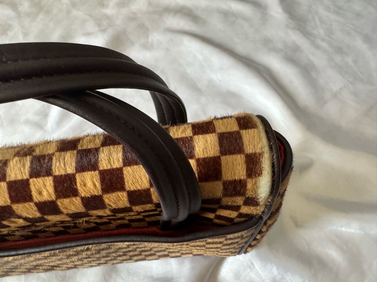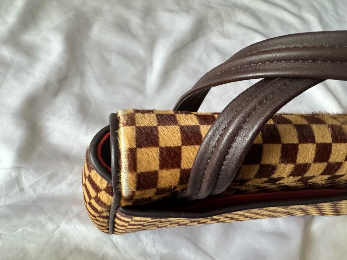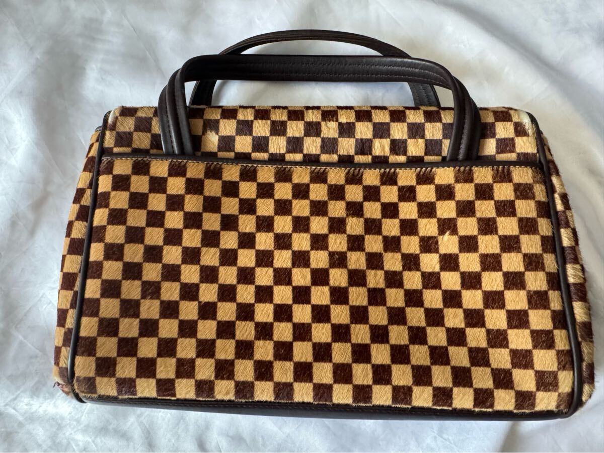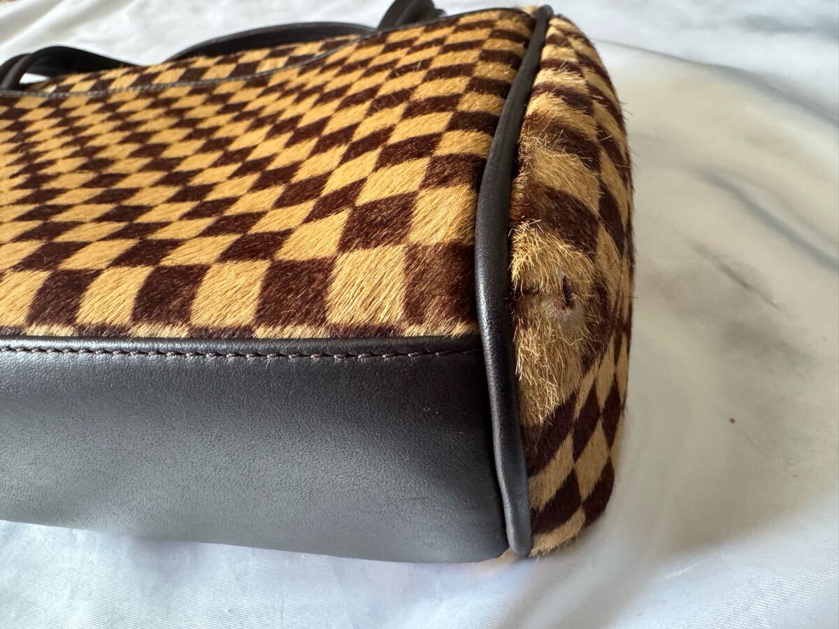 こちらはハラコ素材特有の剥げが見られます。画像にてご確認下さい。ハンドルなどの革部分は綺麗です。内側は少し黒い汚れがございます。