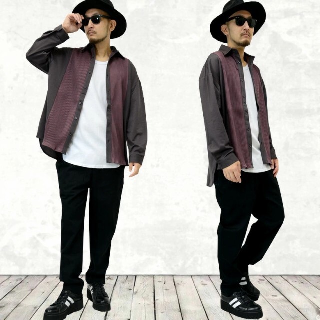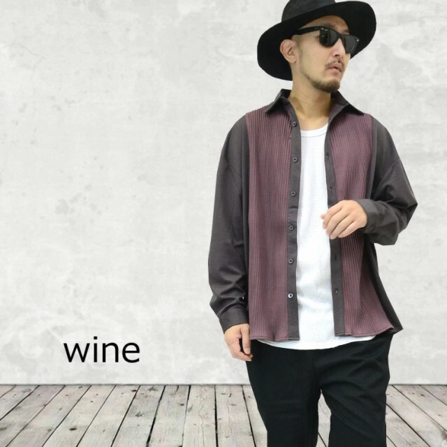 とろみ素材 メンズシャツ 長袖シャツ ロングシャツ プリーツ 切替シャツ 2148vr 送料無料 新品 ワイン L