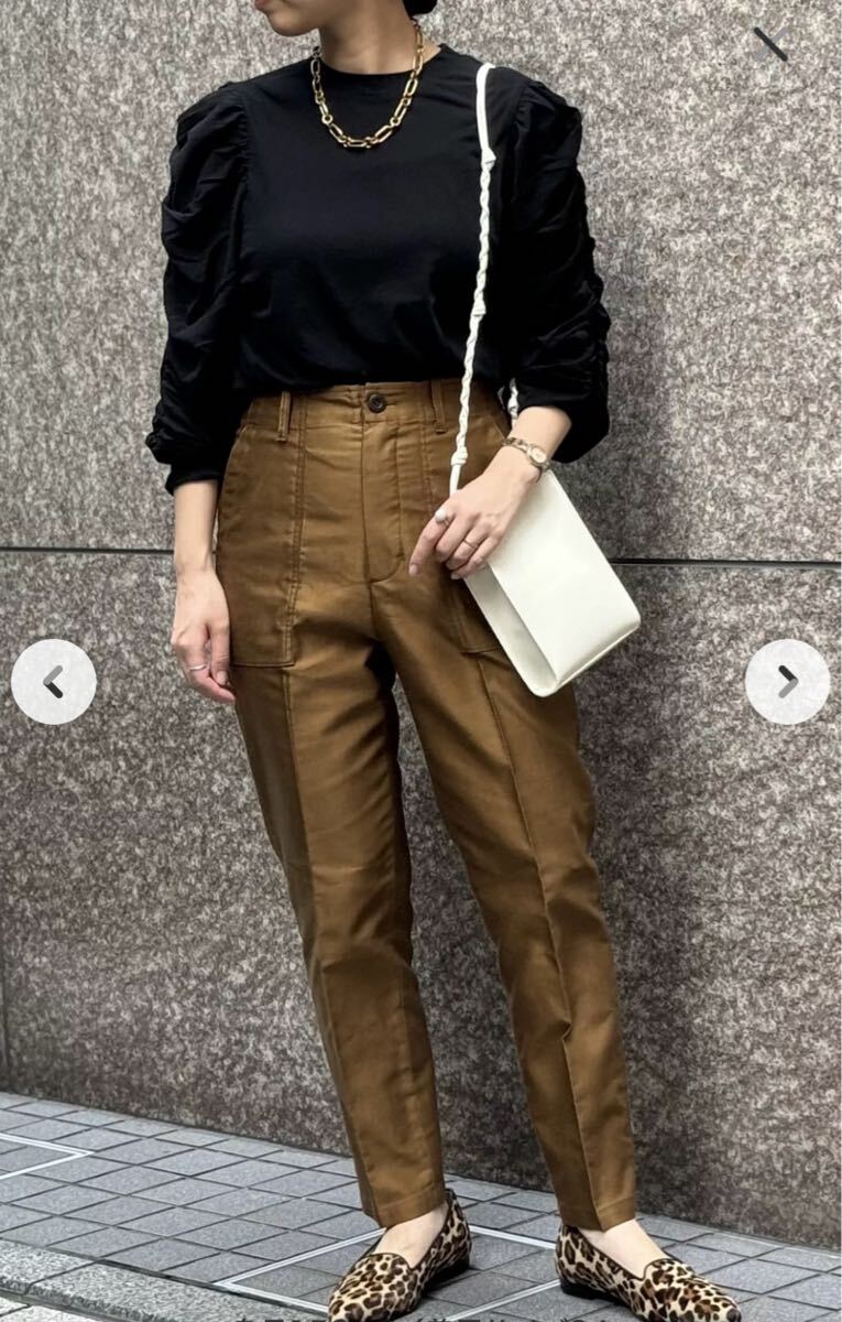 光沢感のある上質なコットン素材で、カジュアルが品よくこなれると大ヒット。高めの腰位置とすっきりとしたフロント、センターラインでスタイルアップもかなう。5サイズあり、足首が見えてもフルレングスでも様になる丈感だから選びやすい。後ろウエストがゴム仕様になっており、窮屈さがないことも人気の理由。