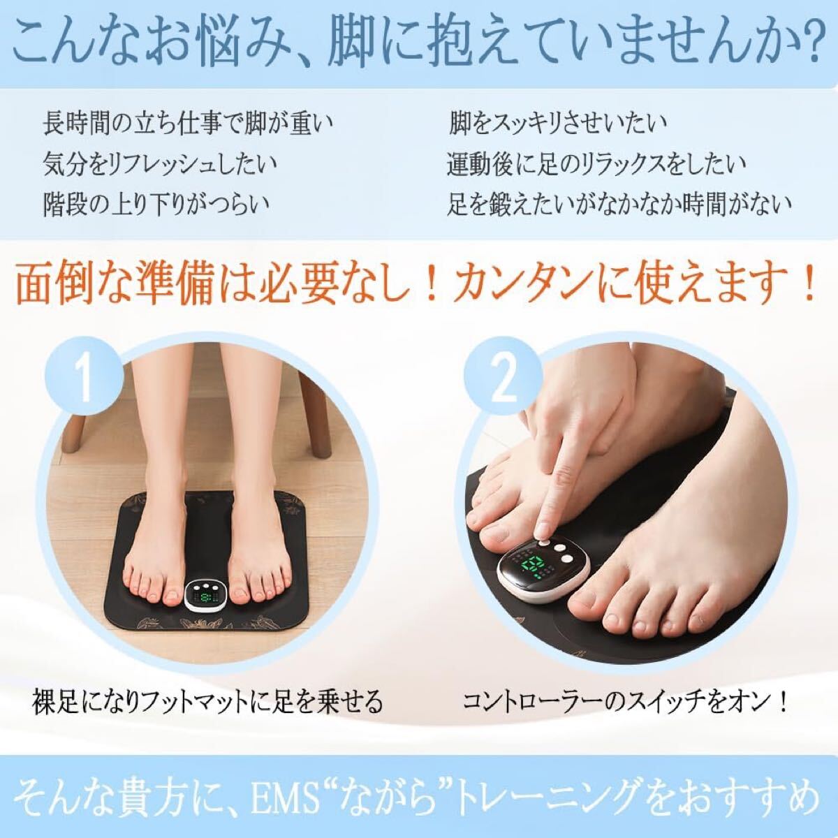 「外を歩くのは大変。気軽に家の中で足をケア」「女性やご年配向けの手軽な足用のEMSはないの?」「立ち仕事が続いているのでスッキリしたい」 そんな方々へ・・・楽々足の”ながらケア”! シリコン製の足用EMSフットマットが登場です! 使い方は簡単!マットに乗ってスイッチをONするだけ!