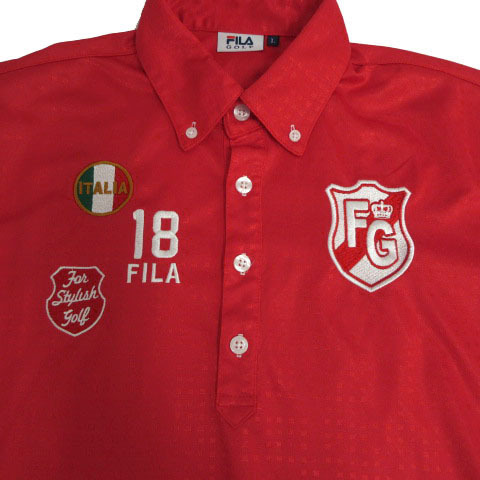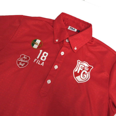 フィラゴルフ FILA GOLF ポロシャツ ボタンダウン ロゴワッペン ロゴ刺繍 半袖 速乾 シャイニー スクエアドット柄 レッド 赤 L メンズ