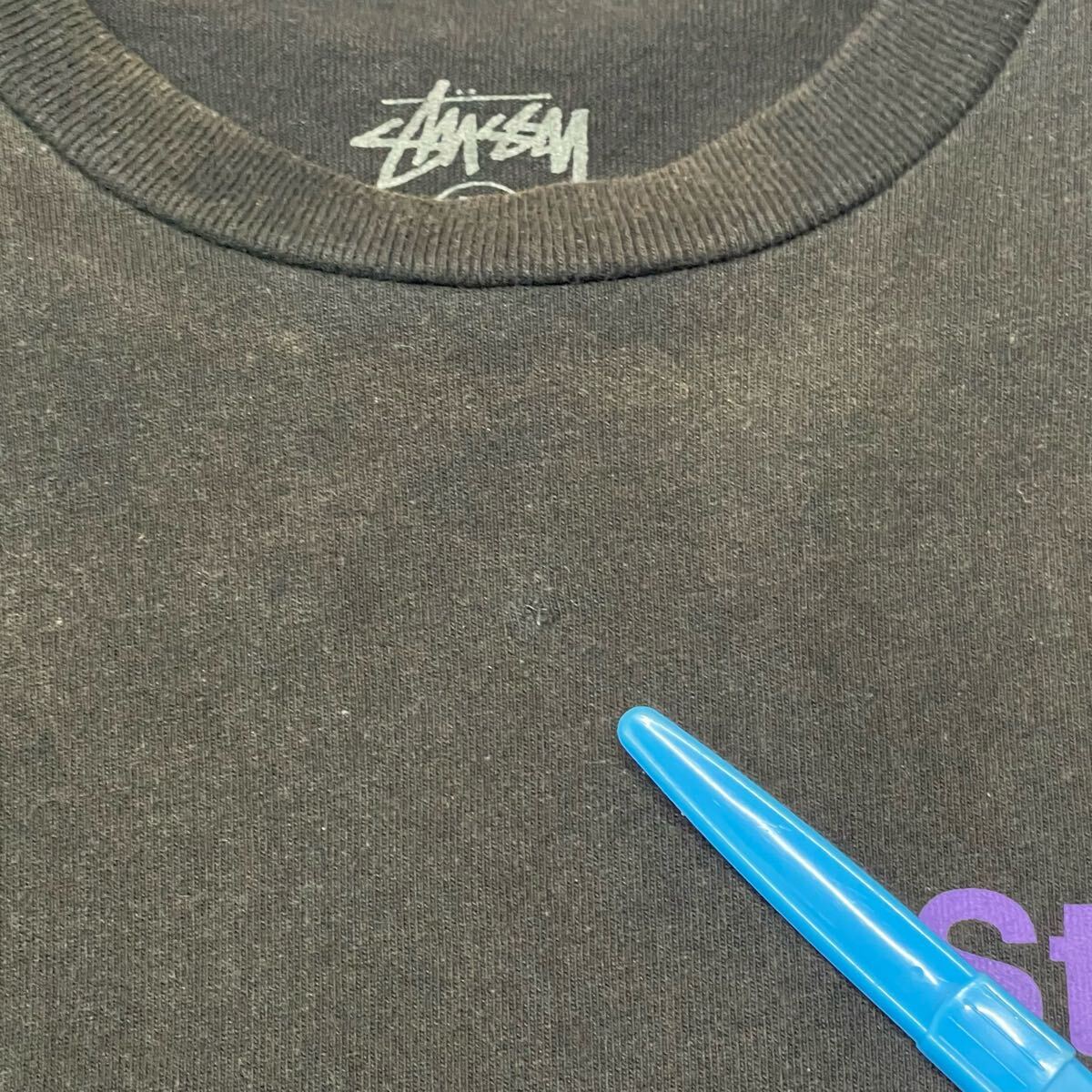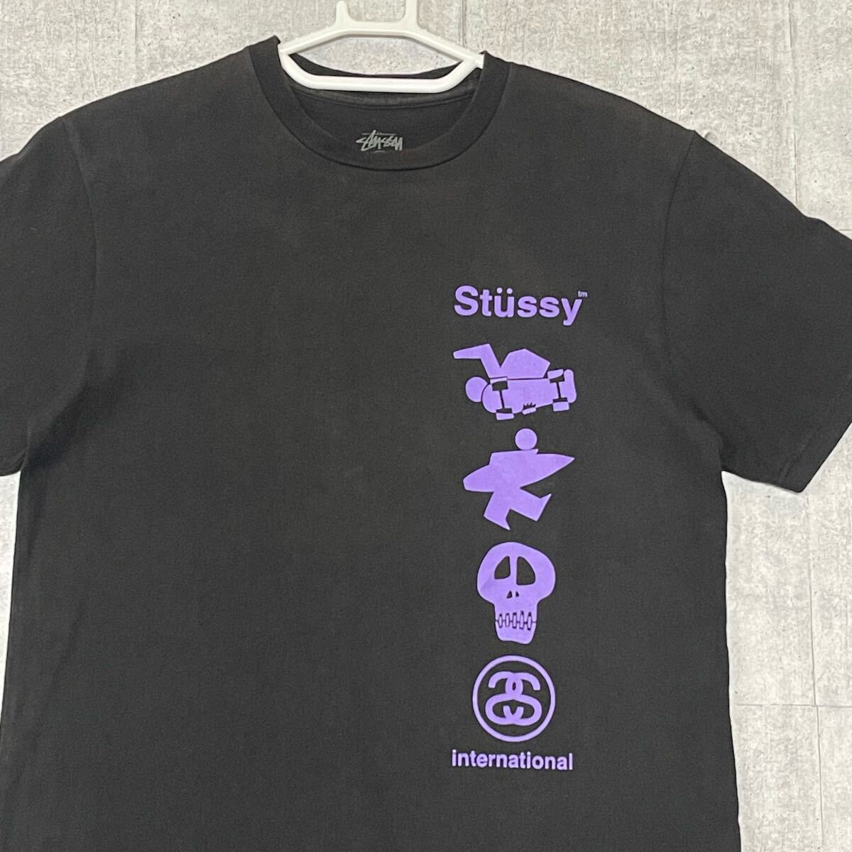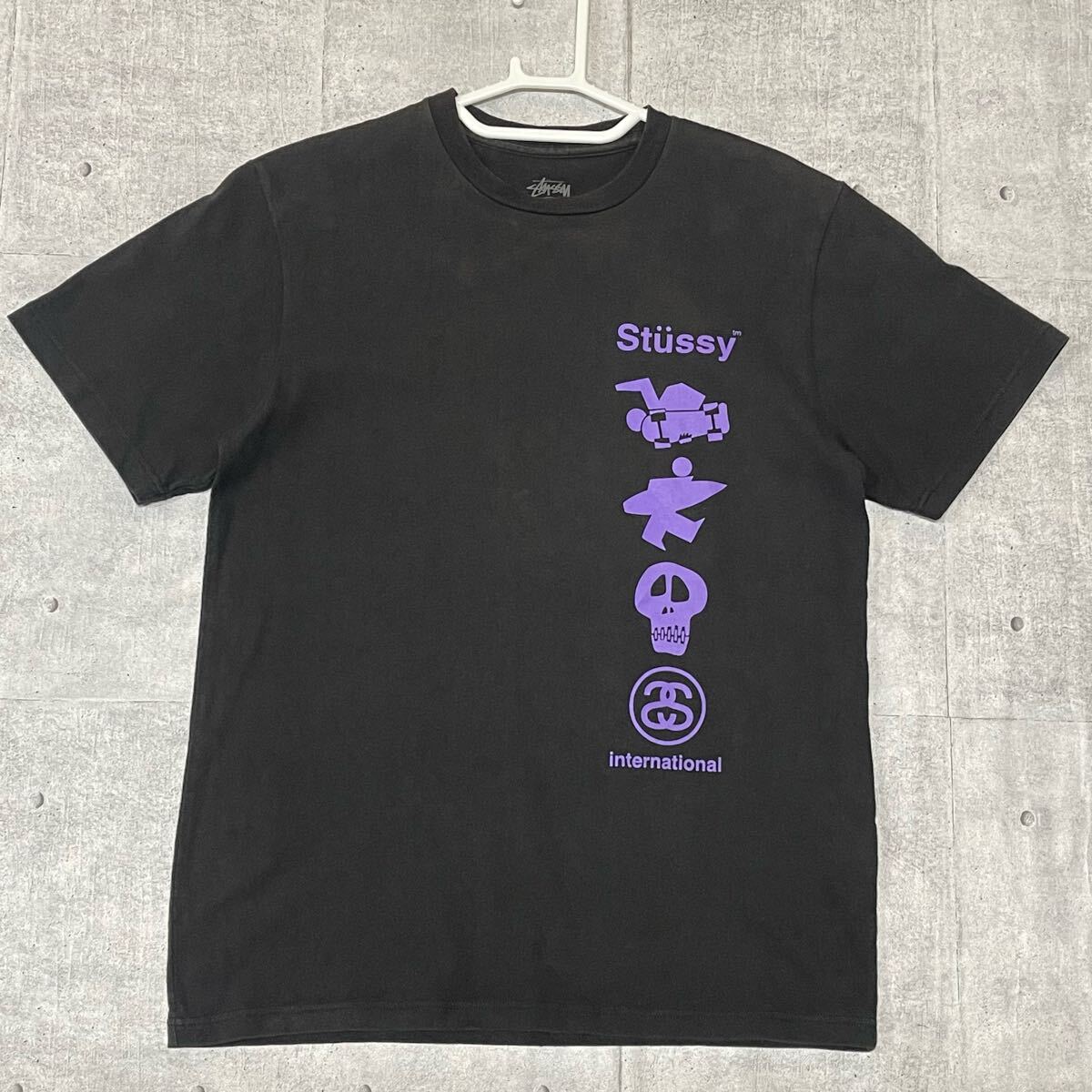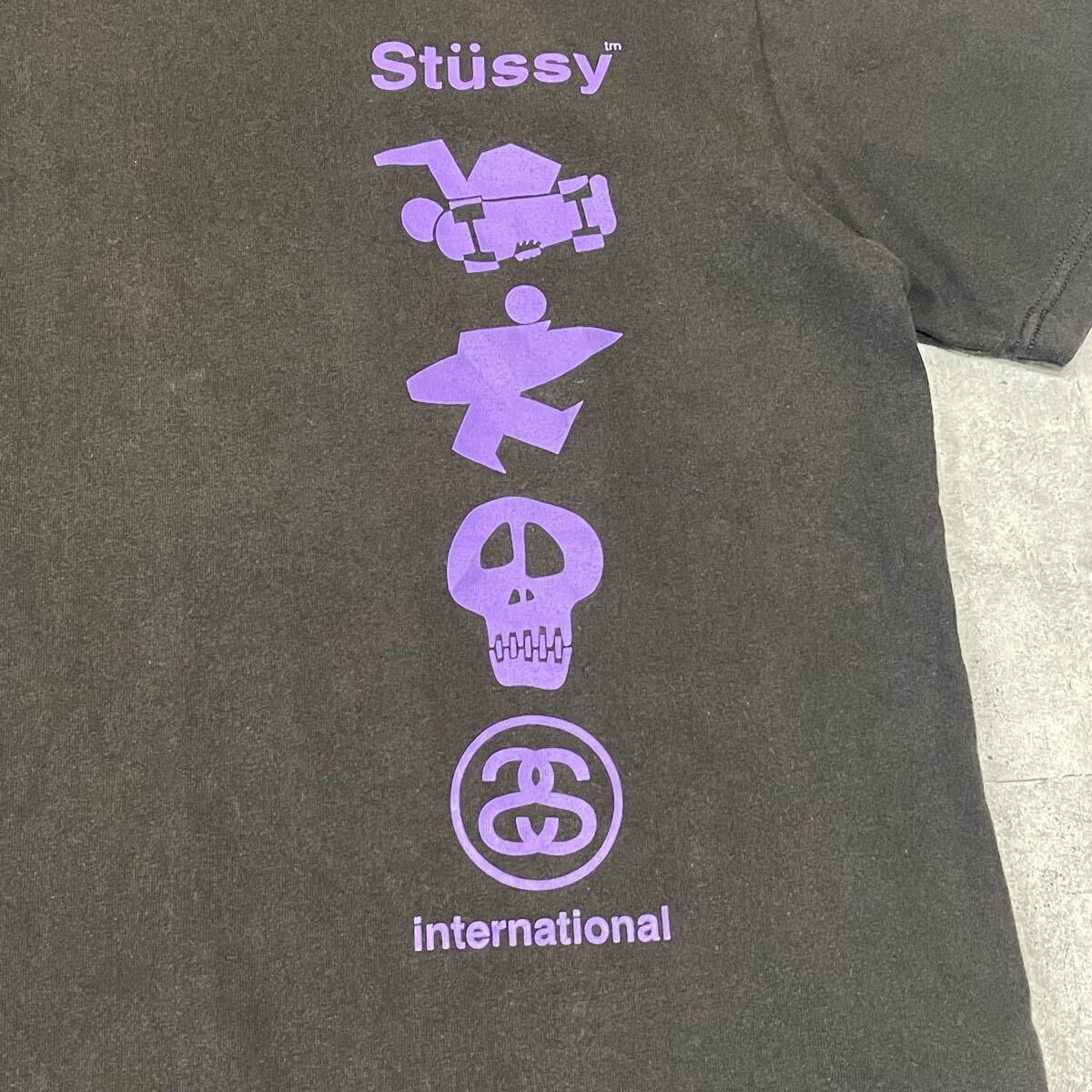 STUSSY INTER NATIONAL ブラック Tシャツ ステューシー  黒 半袖Tシャツ スケート サーフ スカル SSリンク ストリート YL2164 サブカルチャー クルーネック 丸首 ショートスリーブ 色褪せ フェード