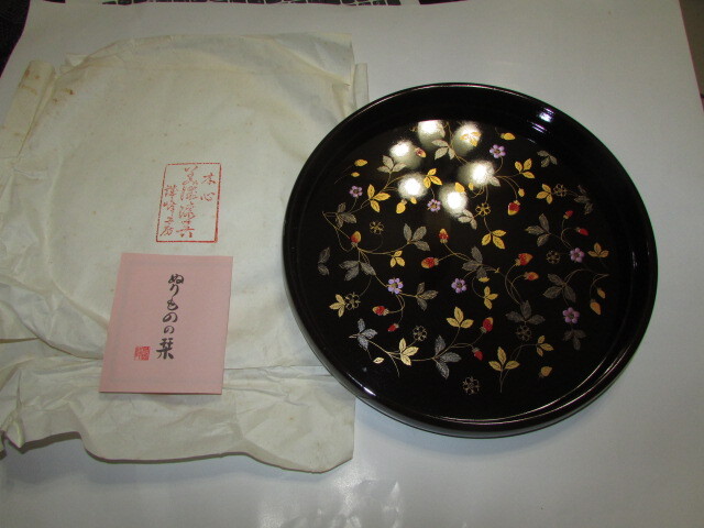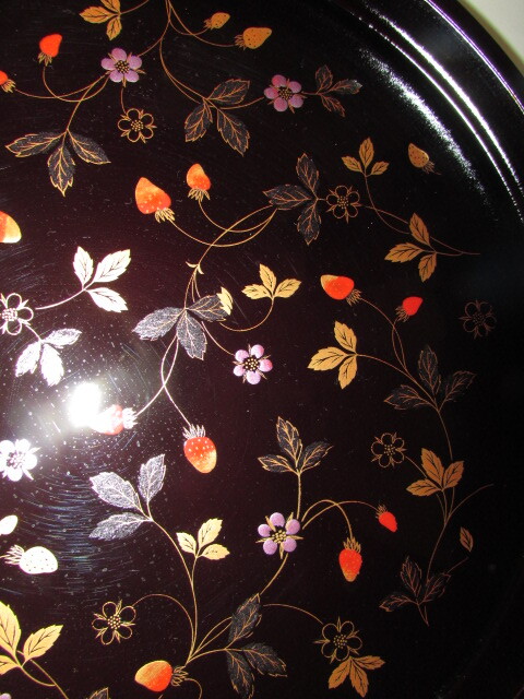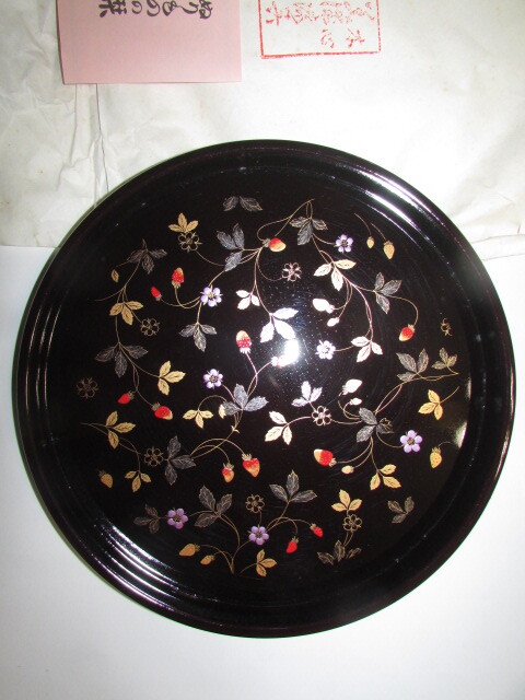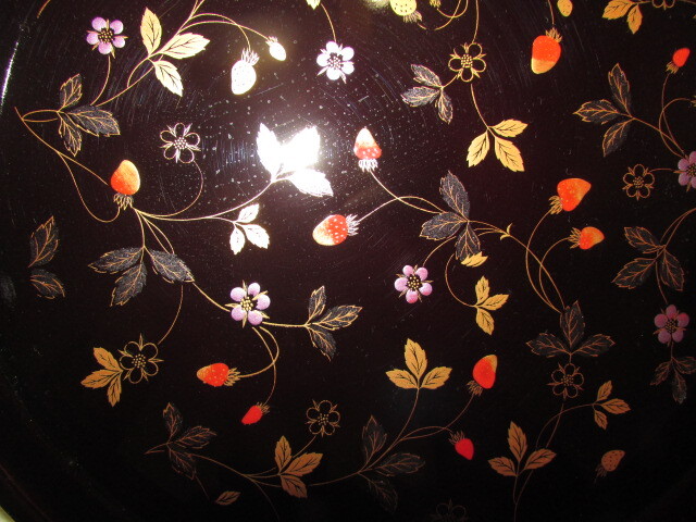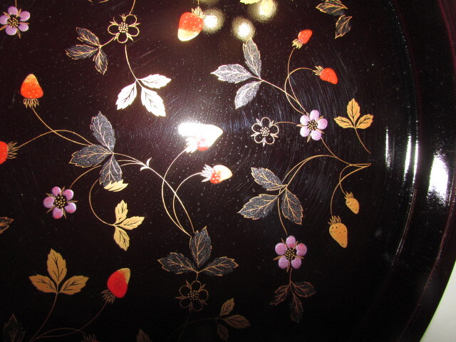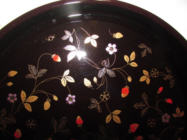即決商品(会津若松・旧家・蔵出し)昭和レトロ(とても綺麗なイチゴ・花唐草模様お盆・木心・美術漆器・〇峰工房)未使用・貴重・珍品