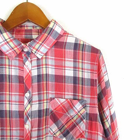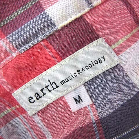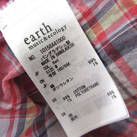 アースミュージック&エコロジー シャツ ブラウス シアー シフォン マドラスチェック コットン ストレッチ 長袖 M 赤 マルチカラー