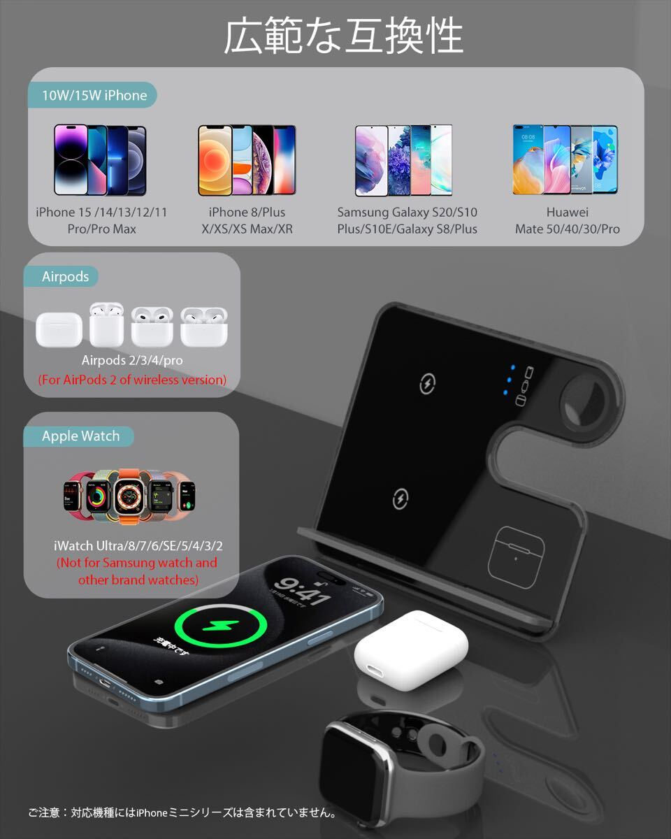 【幅広い交換性】iPhone 16/15/14/13/12シリーズ、iWatch Ultra2/Ultra/SE/9/8/7/6/5/4、AirPods 3/Pro2/Pro、他のQI機能搭載のワイヤレスイヤホン。スマホケースを付けたままでも充電することができます。従来の充電器と異なり、ケースを取り外す手間がありません。この便利な機能により、ユーザーはケースをつけたままでデバイスを充電でき、使用の煩わしさが大幅に減ります。(※8mm以下の厚みの場合に限ります。)