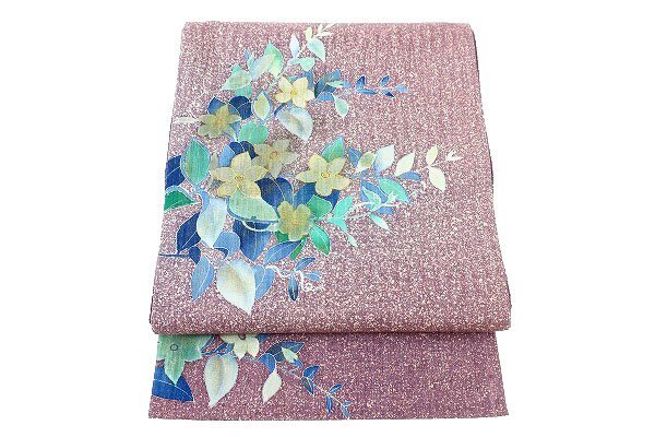 | 【送料無料】未使用品 袋帯 枝花 くすみ紫 銀通し 薪糊 金彩 紬地 長さ4m69cm お洒落 仕立て上がり 正絹 着物フィ m-7588 |