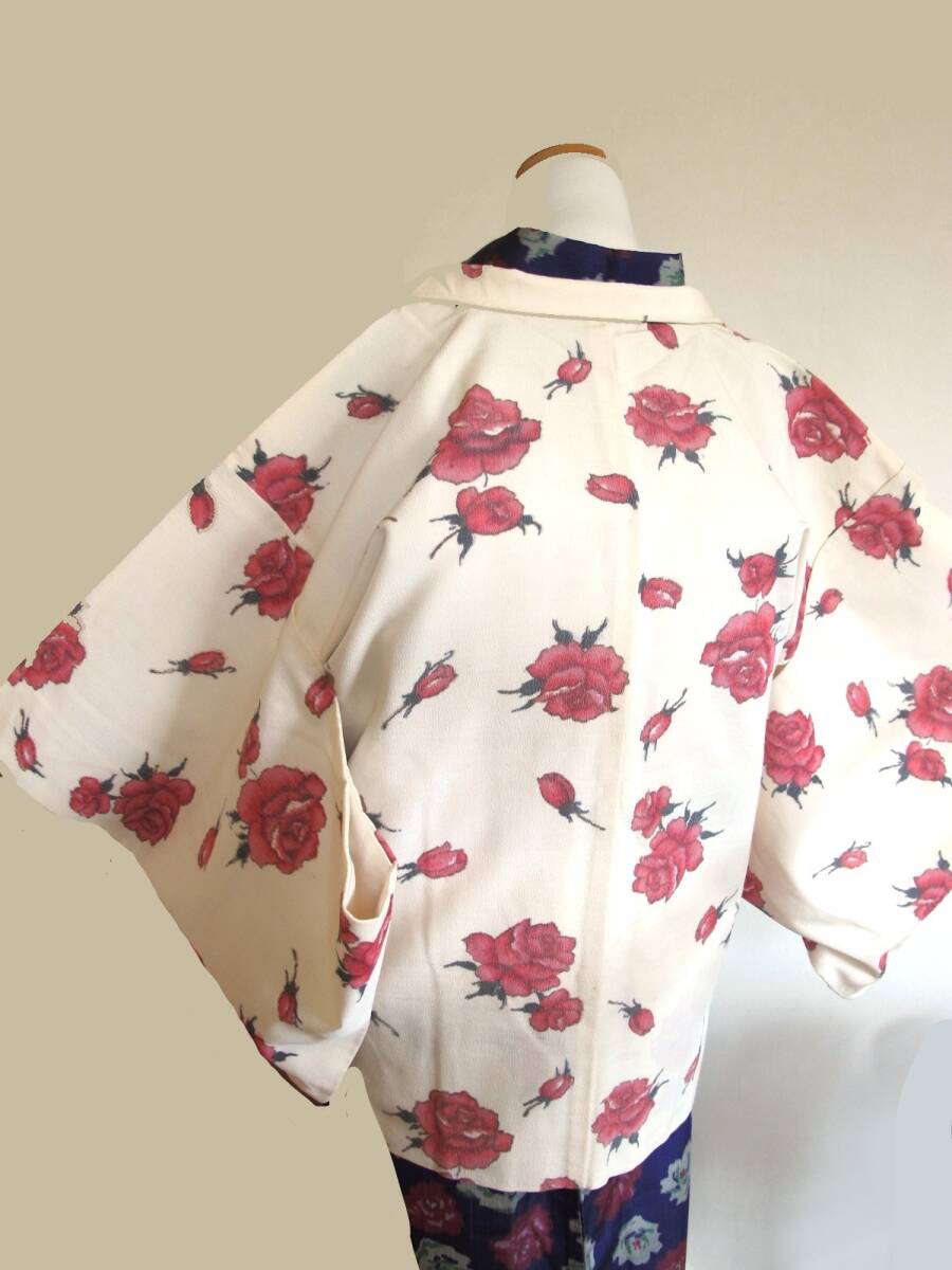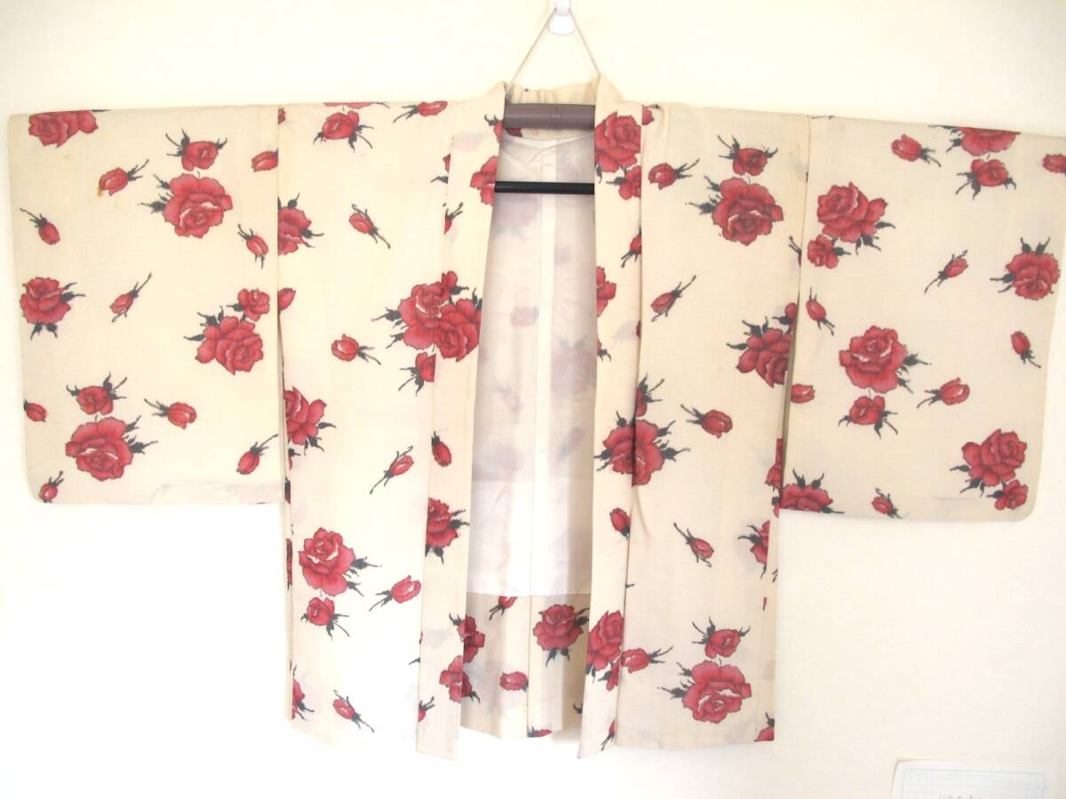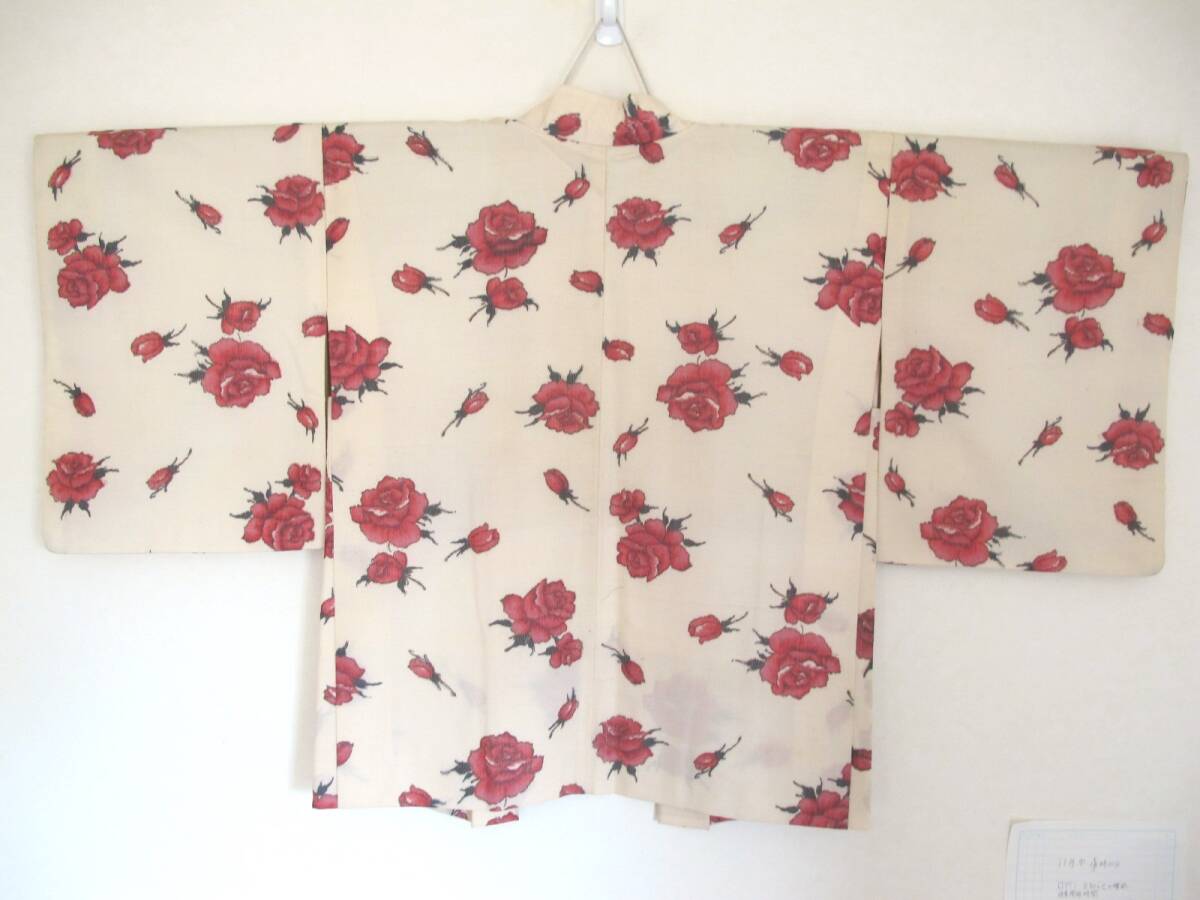 ピンクの薔薇が可愛いセミアンティークのお羽織です。 |